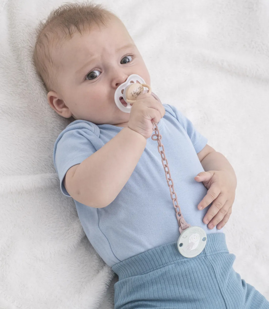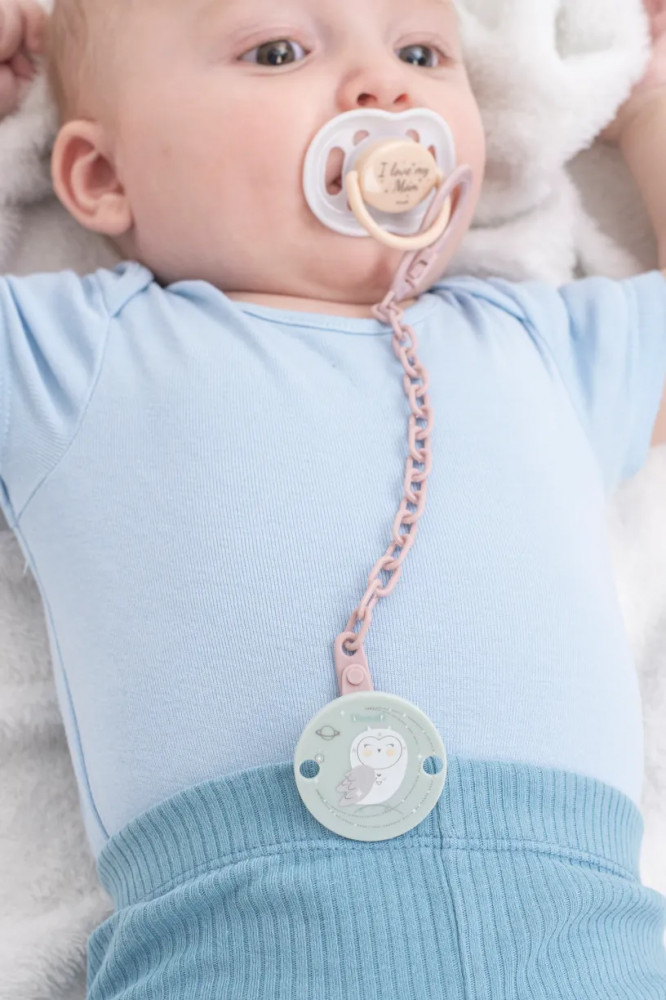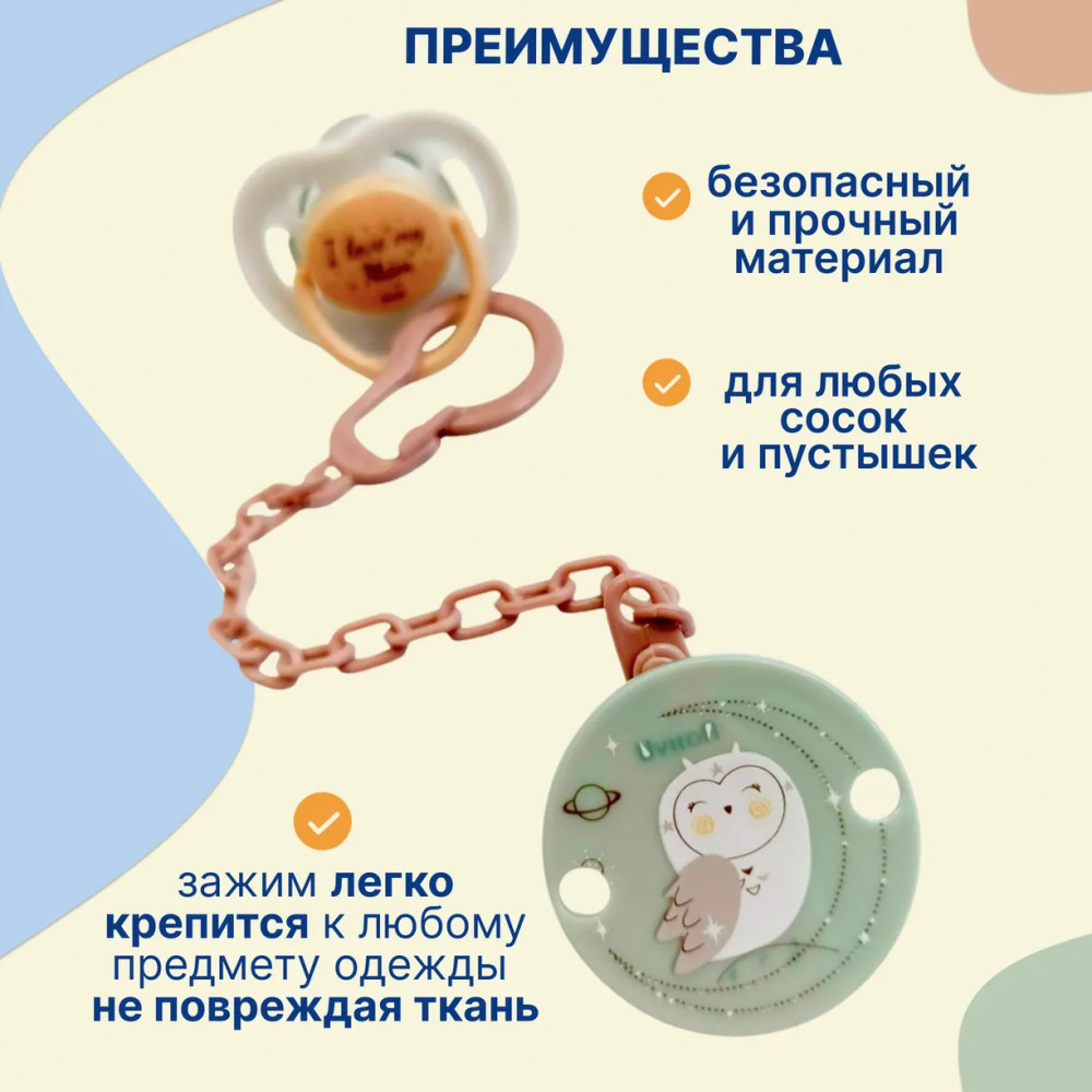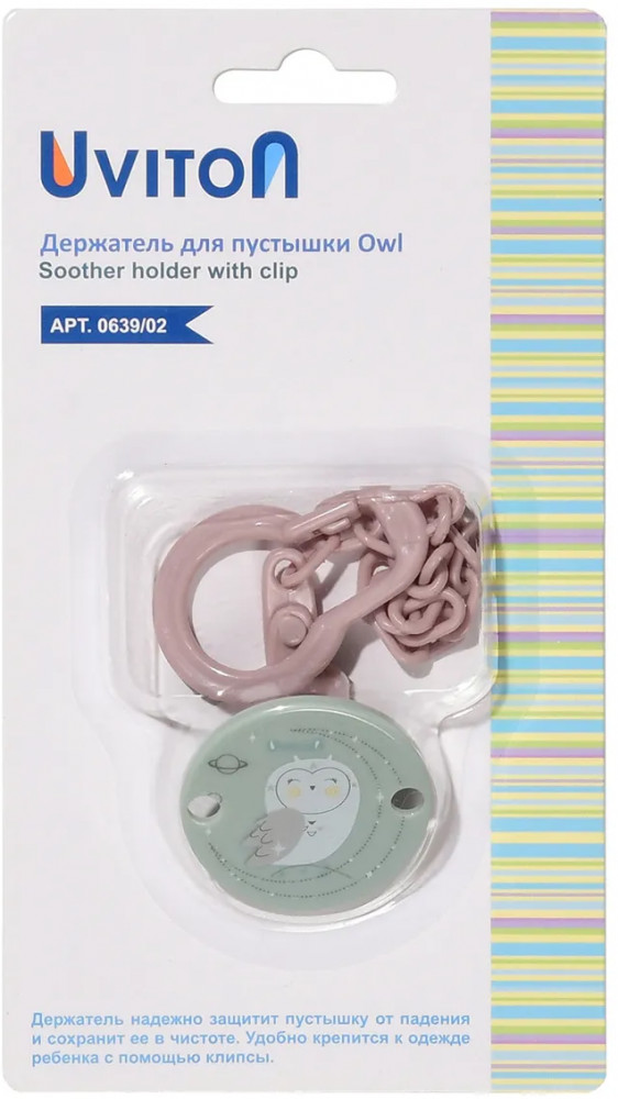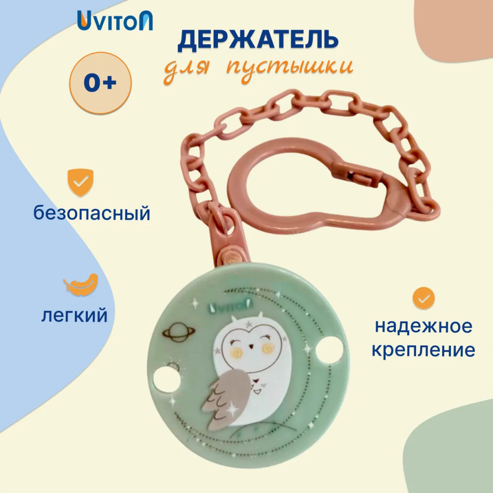 Держатель-клипса для пустышки от Uviton поможет любимой соске пустышке малыша всегда оставаться на месте. С помощью держателя для соски можно держать грызунок. С держателем соска/пустышка вашего малыша всегда будет в чистоте. Зажим-прищепка надежно крепится к одежде и не портит ее. На конце цепочки есть карабин, который зацепляется за кольцо пустышки. С ним можно играть, очаровательный дизайн точно понравится вашему малышу или малышке. Яркие цвета привлекут внимание ребенка и будут отлично смотреться на фоне детской одежды. Держатель для соски пустышки незаменим во время прогулок и путешествий. Вместе с одеждой для новорожденных детский держатель для соски прекрасно дополнит подарочный комплект на выписку в роддом, а так же это отличный подарок на выписку, подарок новорожденному.