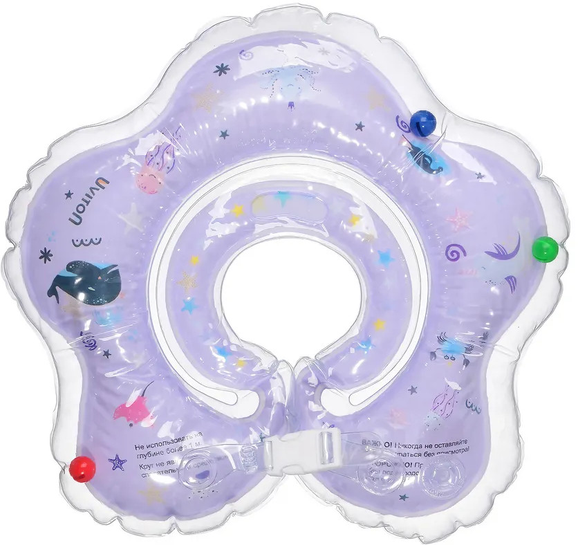 Детский надувной круг на шею с ручками для купания малышей, новорожденных, для плавания в ванной и бассейне от Uviton. Круг на шею для грудничков предназначен для водных процедур, для спорта с самого рождения новорожденного. С этим надувным кругом водные процедуры младенца пройдут весело и просто. Ваш малыш будет свободно держаться на воде, шевелить ручками и ножками, при этом нос и рот будут защищены от попадания воды, а звенящая погремушка внутри развеселит вашего карапуза. Диаметр внутреннего круга примерно 8.5 см, диаметр внешнего — 40 см. Рекомендуемый возраст 0 месяцев до 2 лет.