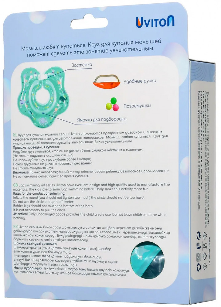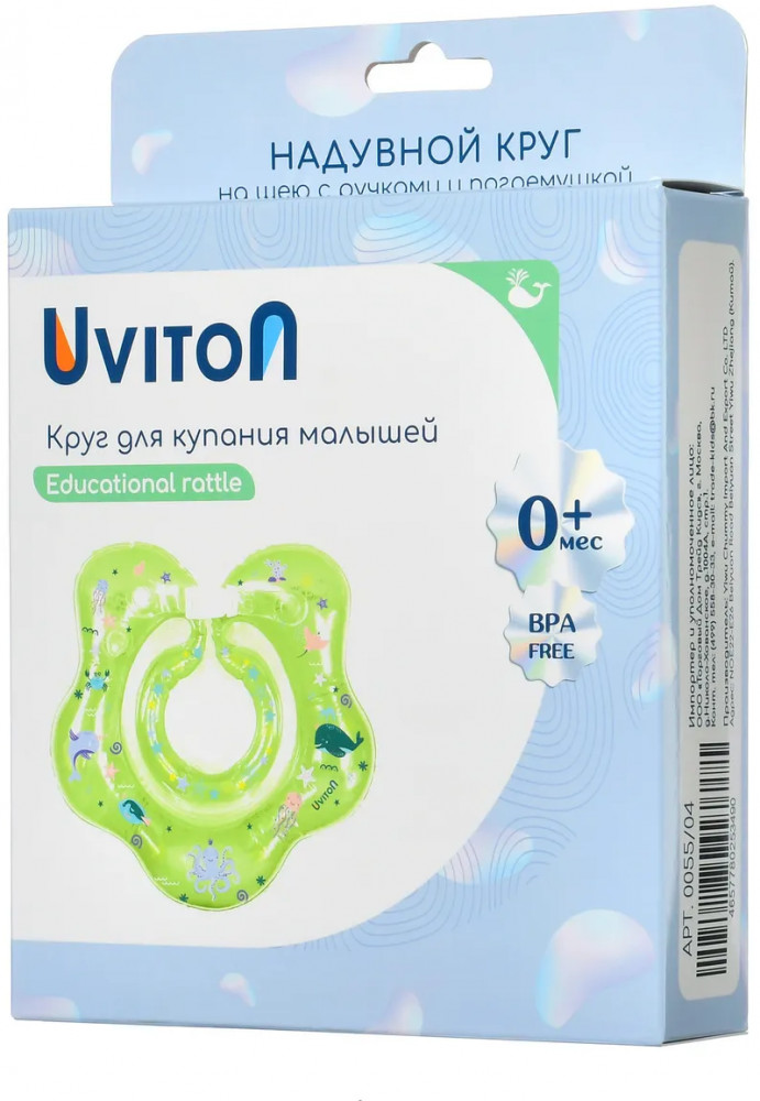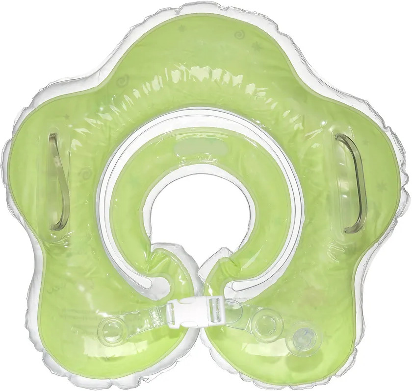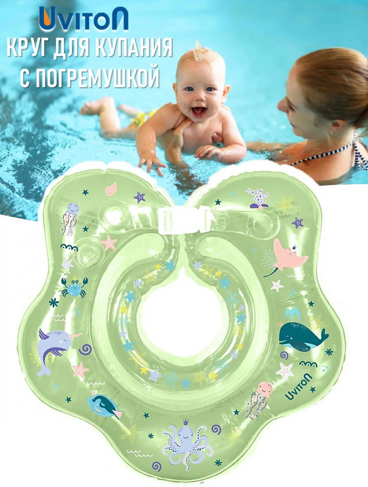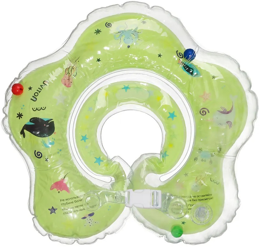 Детский надувной круг на шею с ручками для купания малышей, новорожденных, для плавания в ванной и бассейне от Uviton. Круг на шею для грудничков предназначен для водных процедур, для спорта с самого рождения новорожденного. С этим надувным кругом водные процедуры младенца пройдут весело и просто. Ваш малыш будет свободно держаться на воде, шевелить ручками и ножками, при этом нос и рот будут защищены от попадания воды, а звенящая погремушка внутри развеселит вашего карапуза. Диаметр внутреннего круга примерно 8.5 см, диаметр внешнего — 40 см. Рекомендуемый возраст 0 месяцев до 2 лет.