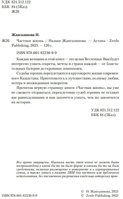 💳 Оплатить за товар можно при получении 🇰🇿 Есть бесплатная доставка по Казахстану от 1 дня 🎁 Копите бонусы с каждой покупки В захватывающей дилогии Назым Жангазиновой переплетаются судьбы разных женщин, живущих в меняющемся Казахстане. От балерин и бизнес-леди до рыночных торговок и домохозяек, их жизни раскрываются через призму любви, потерь, амбиций и социальных перемен. На фоне ярких описаний старинных улочек Алматы разворачиваются истории, полные интриг, надежд и разочарований. Героини сталкиваются с моральными дилеммами, борются за своё место в этой жизни и пытаются найти ответы на вечные вопросы о счастье и самореализации. «Частная жизнь» — это пронзительный взгляд на современное общество, где личные драмы отражают изменения в нем, это история о нас самих, о нашей борьбе за счастье и о том, как мы строим свою судьбу в мире перемен. |