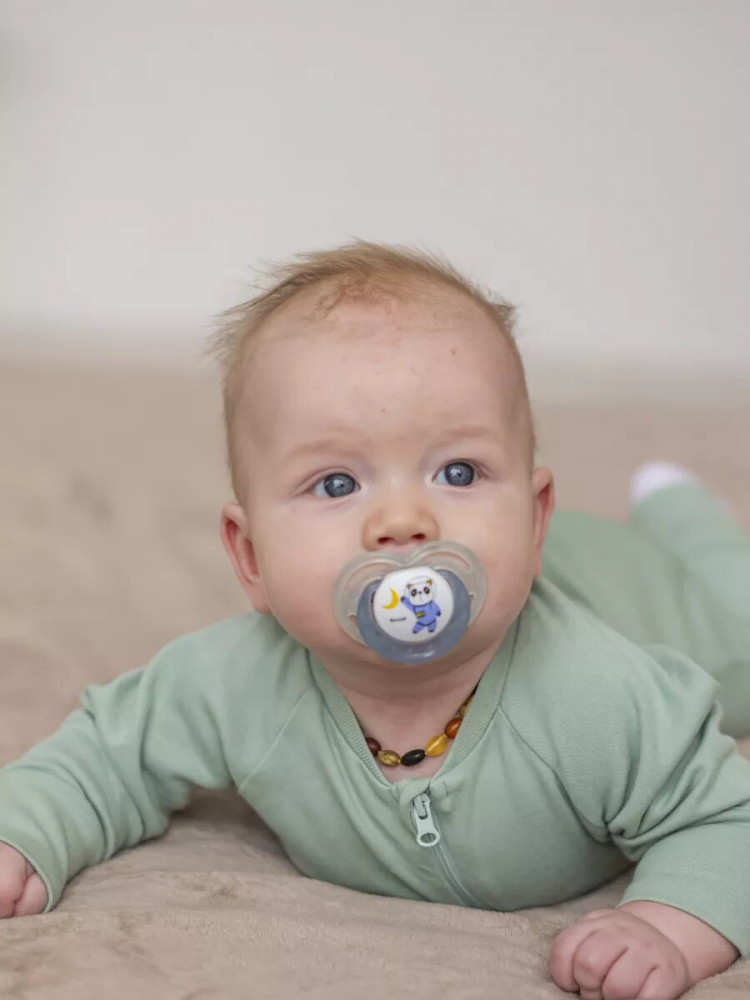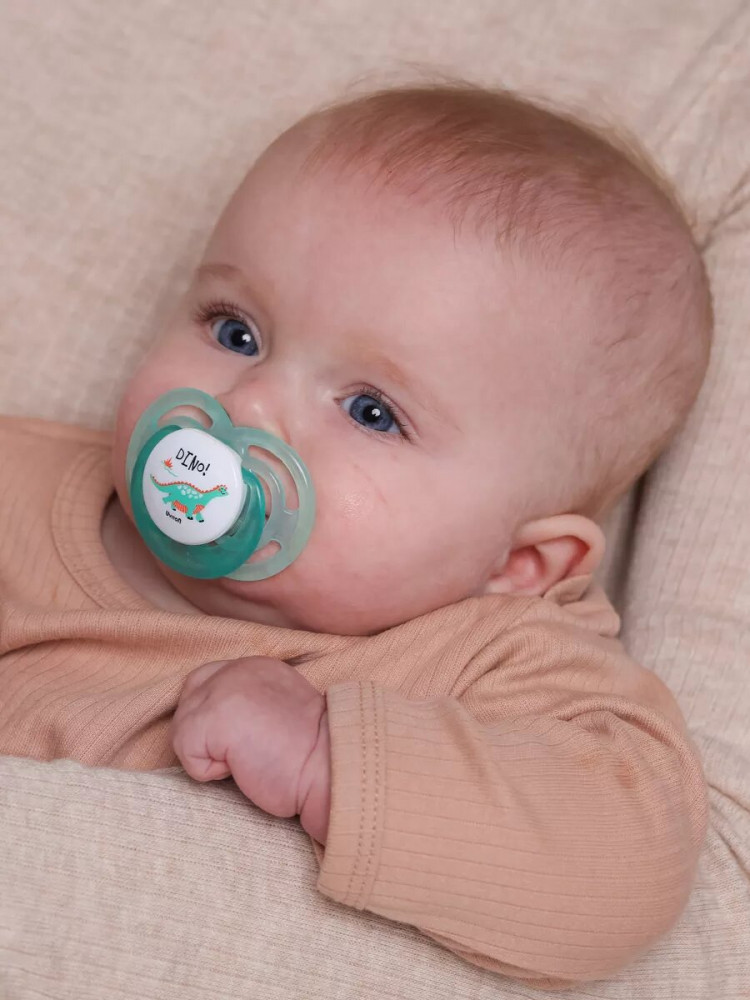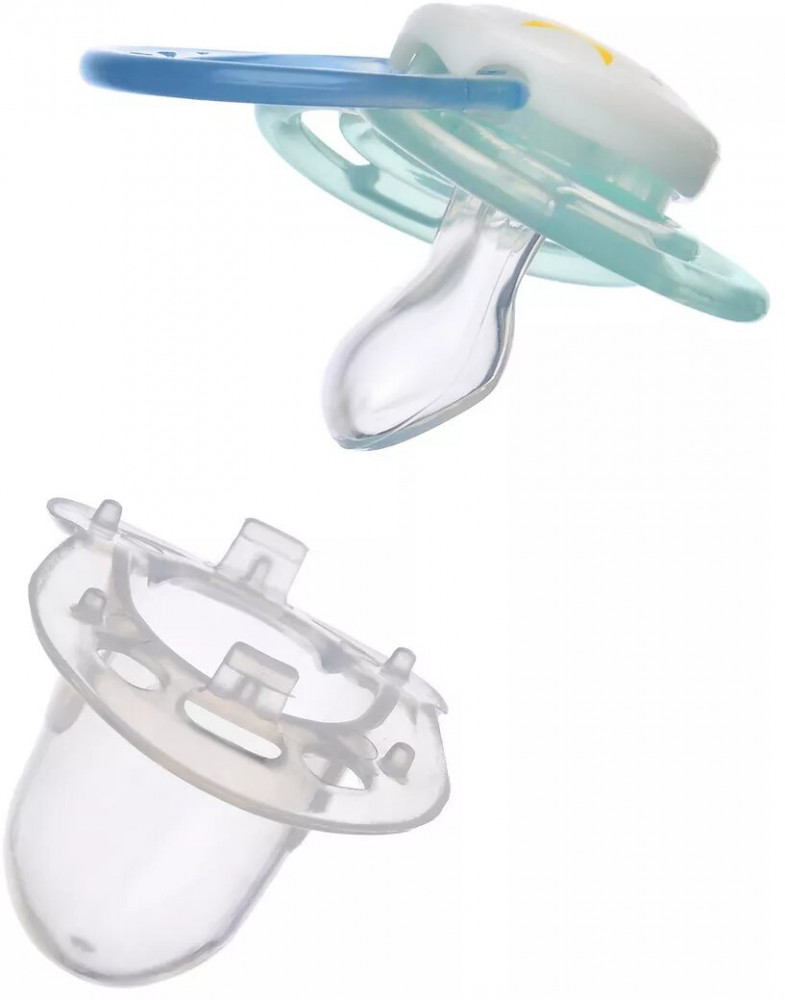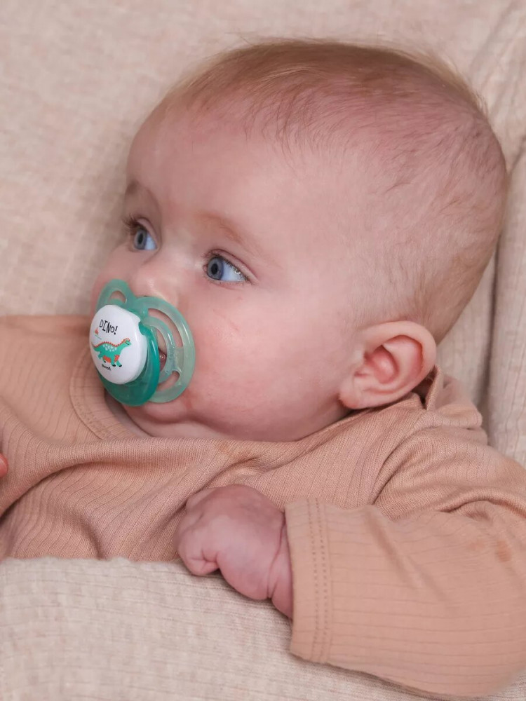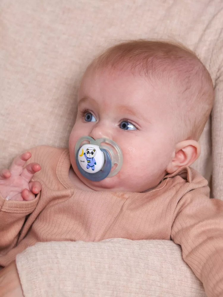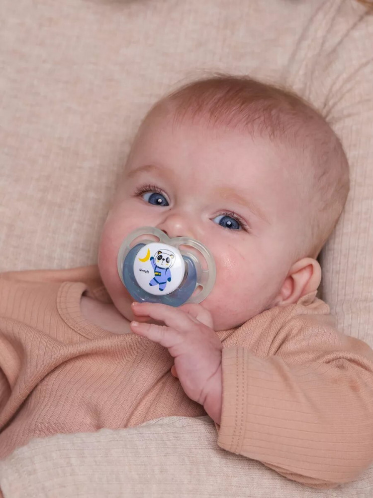 Нагубник пустышки с интересным и ярким дизайном, имеет специальную форму с отверстиями для дополнительной вентиляции и снижает риск раздражения детской кожи. В комплекте есть колпачок для удобства хранения и содержания пустышки в чистоте.