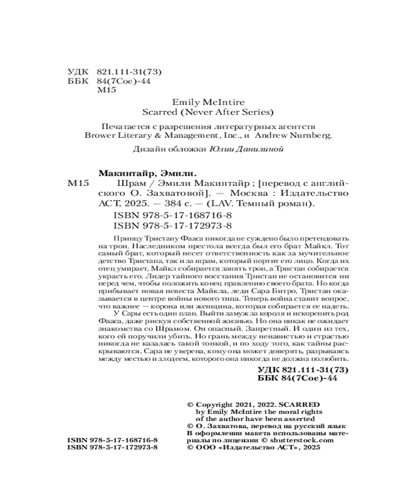 💳 Оплатить за товар можно при получении 🇰🇿 Есть бесплатная доставка по Казахстану от 1 дня 🎁 Копите бонусы с каждой покупки Серия: LAV. Темный роман Принцу Тристану Фааса никогда не суждено было претендовать на трон. Наследником престола всегда был его брат Майкл. Брат, ответственный как за мучительное детство Тристана, так и за шрам, который портит его лицо. После смерти отца Майкл занимает трон, а Тристан собирается украсть его. Лидер тайного восстания, Тристан не остановится ни перед чем, чтобы положить конец правлению своего брата. Но когда прибывает невеста Майкла, леди Сара, Тристан оказывается в центре совсем другой войны. Теперь встает вопрос, что важнее — корона или женщина, которая собирается ее надеть. |