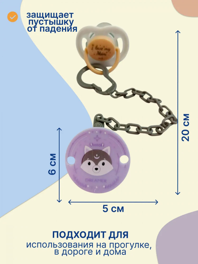 Безвредный материал держателя без острых краев гарантирует безопасность для зубов малыша. Устойчив к укусам зубами ребенка. Подходит для детей с 0 месяцев. Соответствует всем требованиям безопасности детской продукции и имеет сертификат соответствия, как и все наши товары для детей. Легко моется и не впитывает запахи. Изготовлен из прочных безопасных материалов, не содержит бисфенол А (BPA free). Длина цепочки держателя для соски — 20 см, держатель — 6×5 см.
