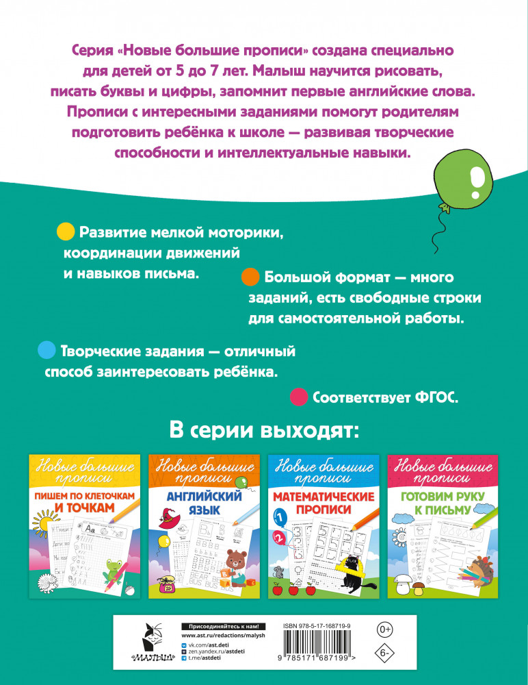 💳 Оплатить за товар можно при получении 🇰🇿 Есть бесплатная доставка по Казахстану от 1 дня 🎁 Копите бонусы с каждой покупки Серия: Новые большие прописи Как организовать подготовку к школе для своего ребёнка? Решение есть! Занимательные развивающие прописи «Для подготовки к школе» помогут подготовить ребёнка к обучению в первом классе и к овладению полезными навыками: он познакомится с алфавитом и потренируется считать от 1 до 10, научится контролировать пишущую руку, сможет красиво и аккуратно писать буквы и цифры, соблюдая границы строки, разовьёт внимание и зрительно-пространственную ориентацию, умение контролировать темп при письме, а также саморегуляцию и контроль, что важно для формирования произвольного внимания и усидчивости. Прекрасно оформленная и методически выверенная книга большого формата поможет вам в ваших занятиях с дошкольником и превратит их в чудесное путешествие в Страну знаний. Для дошкольного и младшего школьного возраста. |