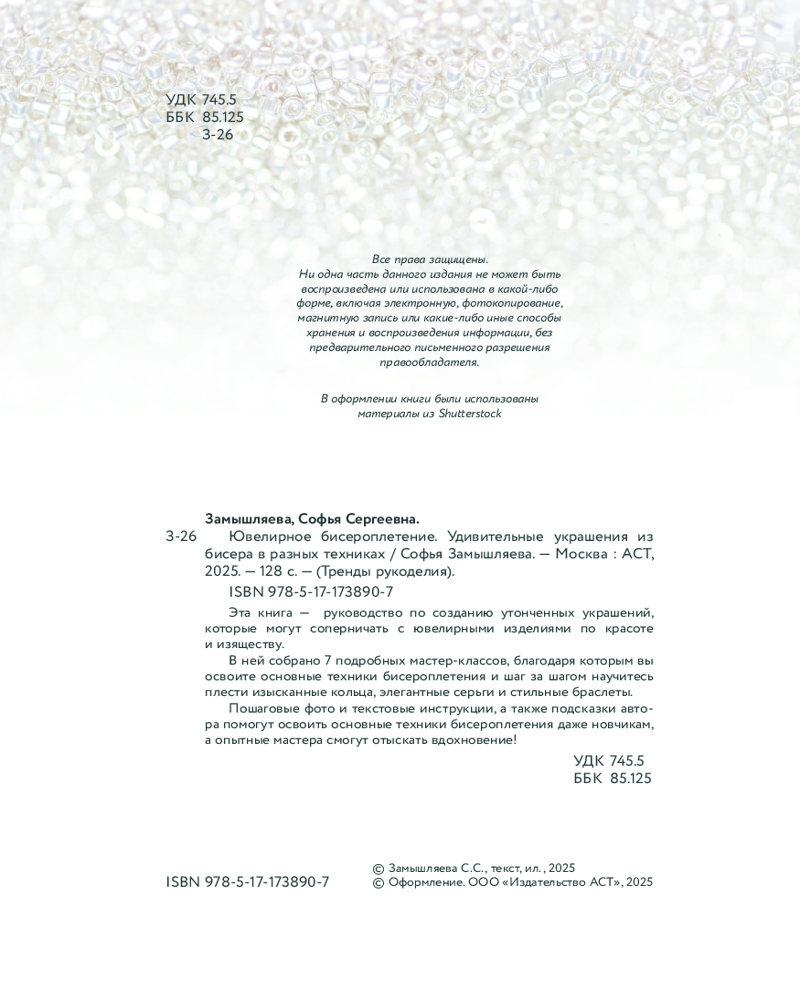💳 Оплатить за товар можно при получении 🇰🇿 Есть бесплатная доставка по Казахстану от 1 дня 🎁 Копите бонусы с каждой покупки Серия: Тренды рукоделия Эта книга — руководство по созданию утонченных украшений, которые могут соперничать с ювелирными изделиями по красоте и изяществу. Благодаря 7 подробным мастер-классам вы освоите основные техники бисероплетения и шаг за шагом научитесь плести изысканные кольца, элегантные серьги и стильные браслеты. Пошаговые фото и текстовые инструкции, а также подсказки автора помогут вам быстро освоить основные техники бисероплетения! |