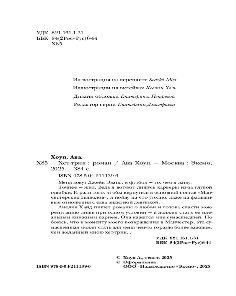💳 Оплатить за товар можно при получении 🇰🇿 Есть бесплатная доставка по Казахстану от 1 дня 🎁 Копите бонусы с каждой покупки Серия: Невозможно устоять. Горячие романы Авы Хоуп Меня зовут Джейк Эванс, и футбол — то, чем я живу. Точнее — жил. Ведь я вот-вот лишусь карьеры из-за глупой ошибки. И ради того, чтобы вернуться в основной состав «Манчестерских дьяволов», я пойду на что угодно, даже на фальшивые отношения с едва знакомой девушкой. Амелия Хайд пишет романы о любви и готова спасти мою репутацию лишь при одном условии — я должен стать ее идеальным книжным парнем. Она кажется мне сумасшедшей. Но боюсь, что к моменту моего возвращения в Манчестер эта сумасшедшая может стать для меня чем-то гораздо более важным, чем желанный мною хет-трик... |