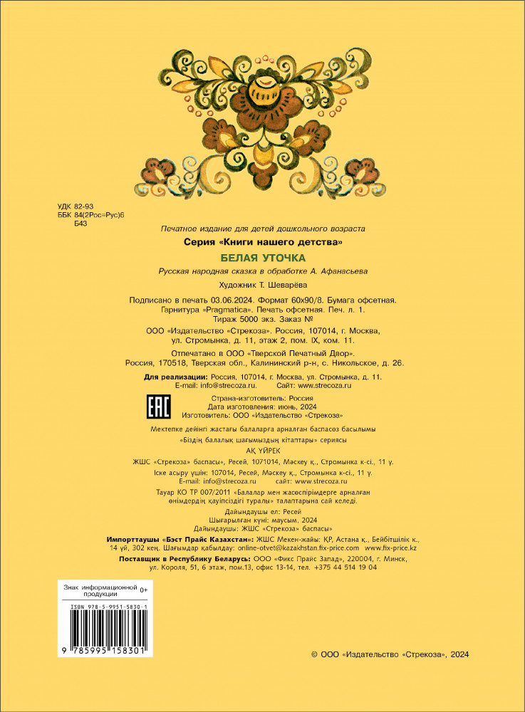 💳 Оплатить за товар можно при получении 🇰🇿 Есть бесплатная доставка по Казахстану от 1 дня 🎁 Копите бонусы с каждой покупки Злая ведьма пытается разлучить князя с его молодой женой. Она заколдовала бедную девушку и заняла ее место. Кто же поможет вывести колдунью на чистую воду? Читайте и узнаете! Русская народная сказка в обработке А. Афанасьева. |