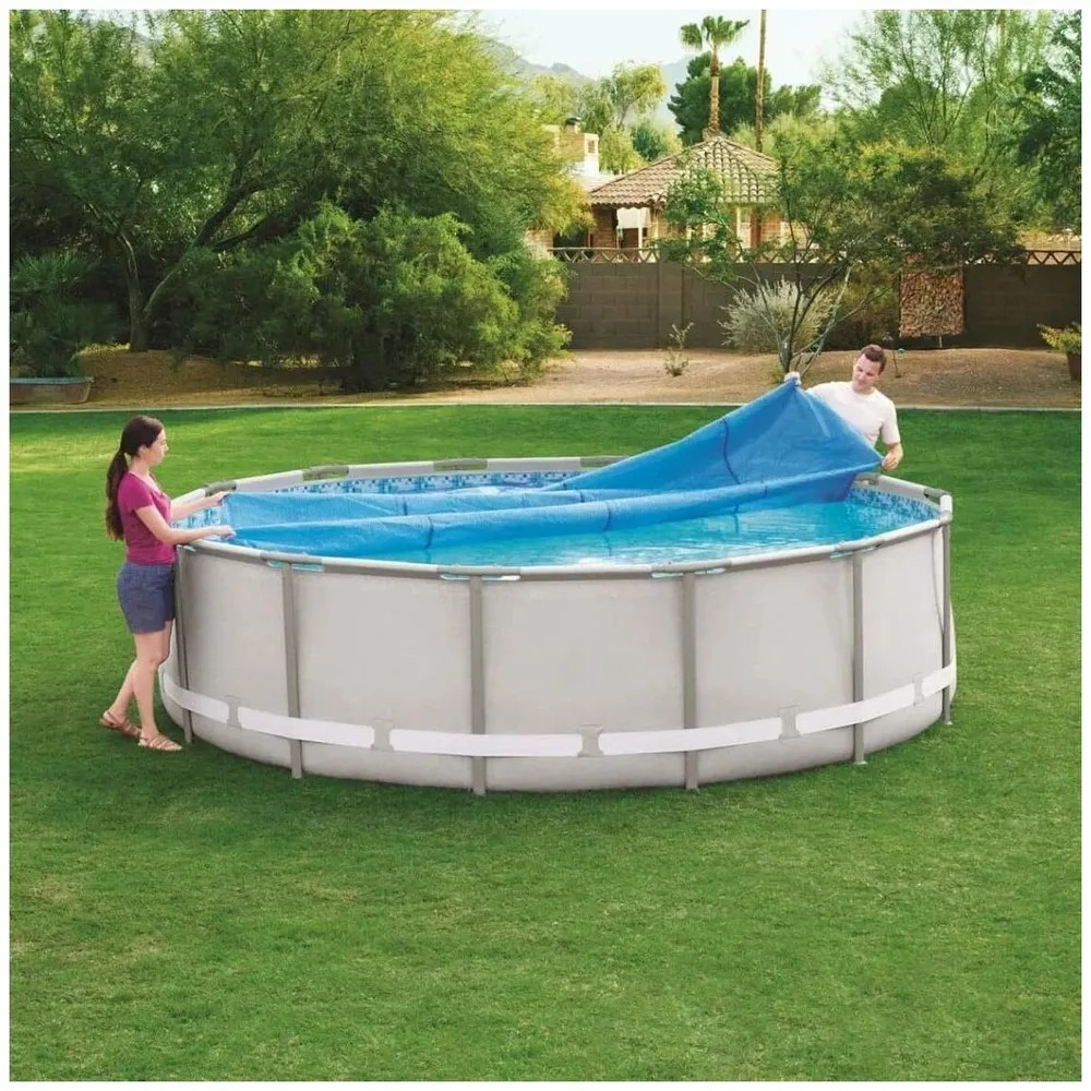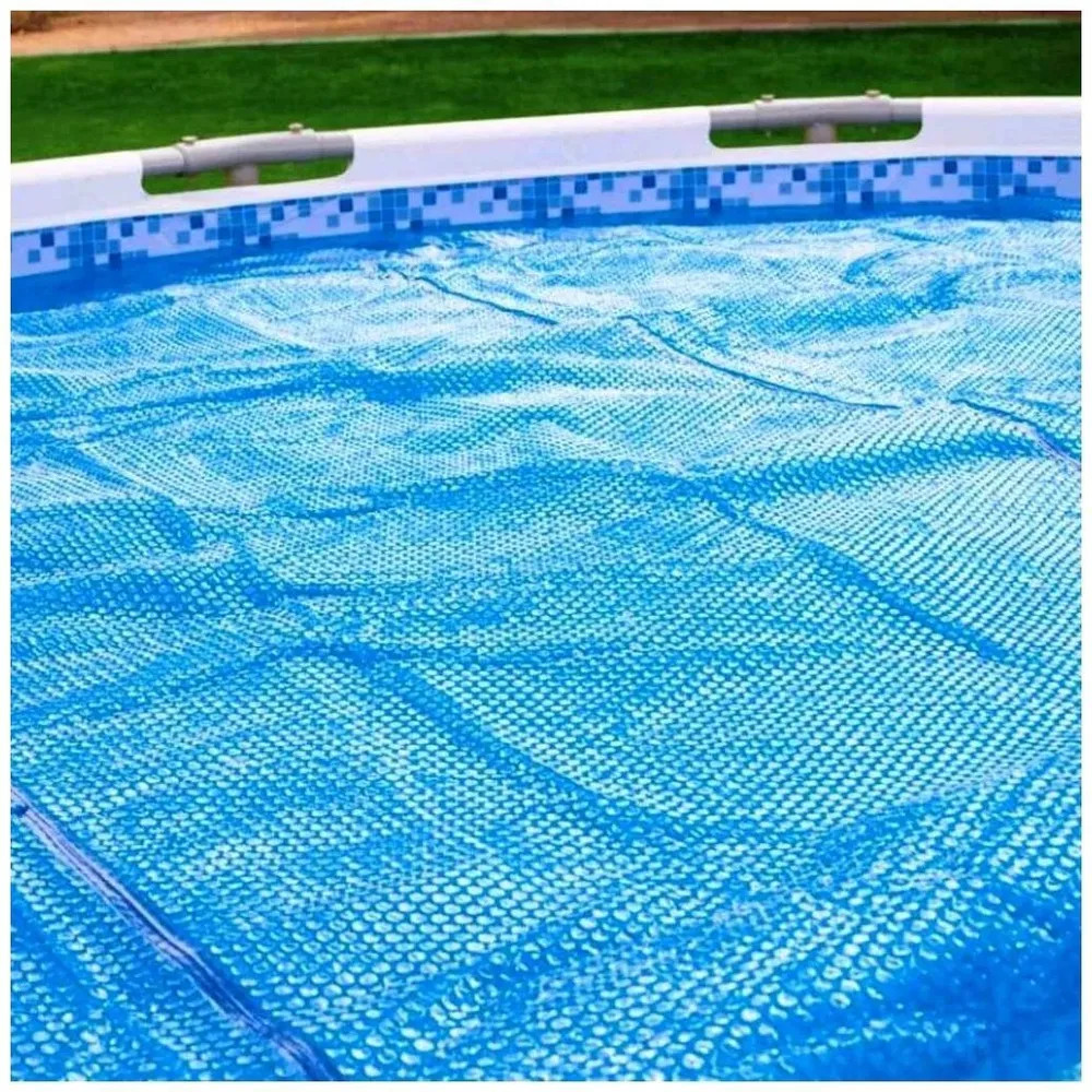 Тент солнечный для бассейнов диаметром до 549 см. Тент сохраняет воду чистой, служит для поддержания температуры воды и препятствует испарению. Увеличивает эффективность работы нагревателей. Уменьшает процент теплопотери. Рекомендуется накрывать бассейн тентом на все время, пока бассейн не используется. Также в тенте имеется дренажные отверстия для предотвращения скопления воды и повреждения тента.