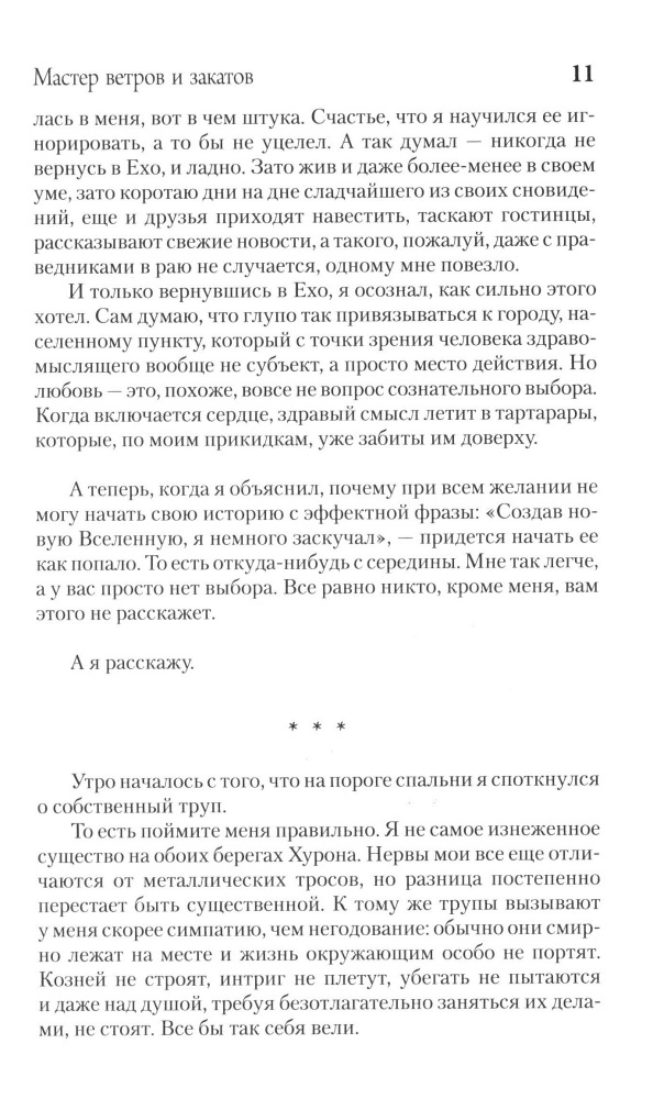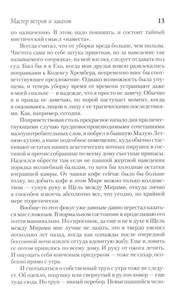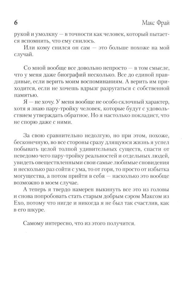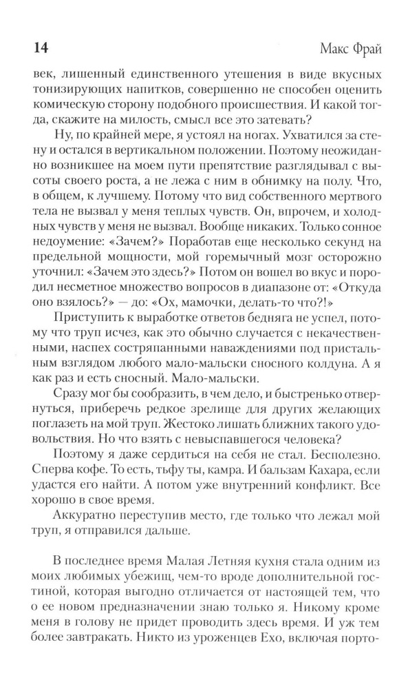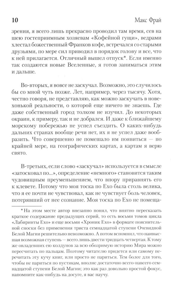 Макс Фрай один из любимых авторов. Как только узнала о выходе этой книги с нетерпением ждала ее появления в продаже. Для тех, кому полюбились Лабиринты Ехо и Хроники Ехо к прочтению обязательно. Долгожданное продолжение приключений сэра Макса вновь позволит окунуться в прекрасный мир Ехо. Конечно, за прошедшие годы стиль автора несколько изменился, однако от этого читать не становится менее интересно. При получении книги была приятно удивлена. Красивая обложка с глянцевыми буквами и рисунком, интересное оформление внутри и белые странички из достаточно плотной бумаги. Качество просто отличное - красивая книга и интересное содержание.