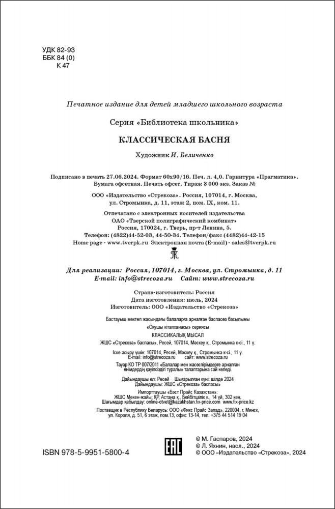 💳 Оплатить за товар можно при получении 🇰🇿 Есть бесплатная доставка по Казахстану от 1 дня 🎁 Копите бонусы с каждой покупки Серия: Библиотека школьника Басня - один из древнейших литературных жанров, который пользуется популярностью у поэтов и писателей разных времен. В этот сборник вошли басни античных, западноевропейских и русских писателей: Эзопа, Леонардо да Винчи, Жана де Лафонтена, И. А. Крылова, Л. Н. Толстого. Перевод М. Гаспарова, Л. Яхнина и др. |