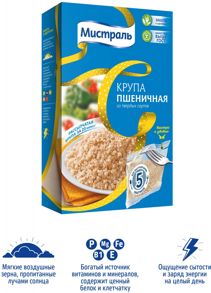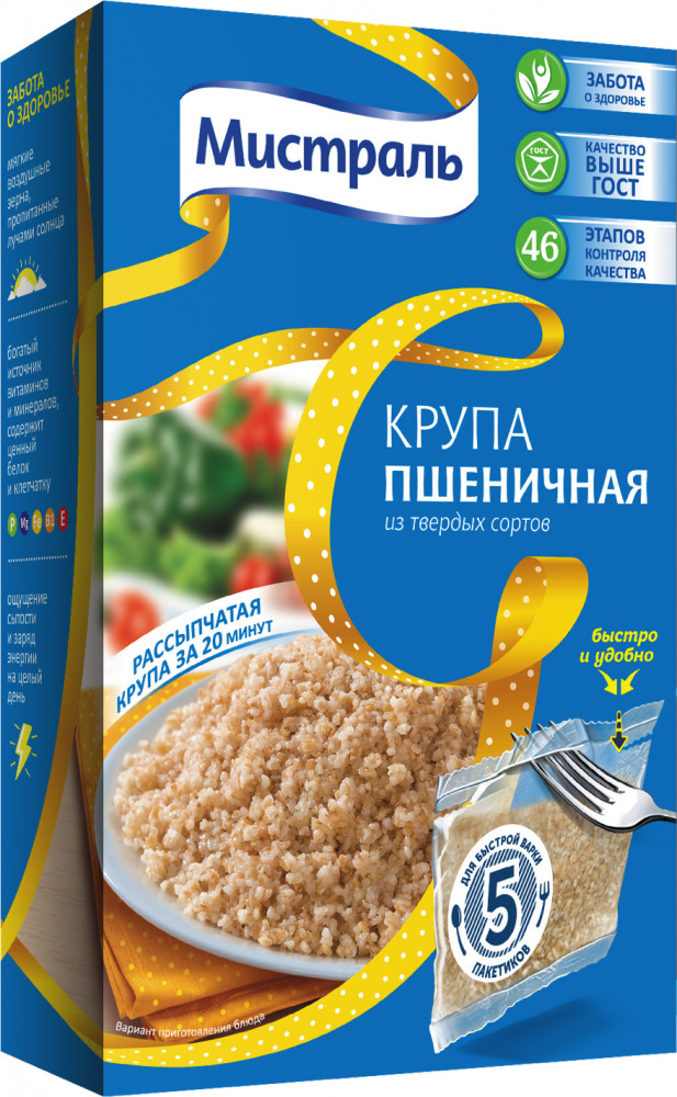 Пшеничная крупа Мистраль — это высококачественный продукт, который станет отличным выбором для приготовления разнообразных блюд. Крупа изготовлена из отборной пшеницы, прошедшей тщательную обработку и очистку, что обеспечивает ее высокое качество и натуральный вкус.