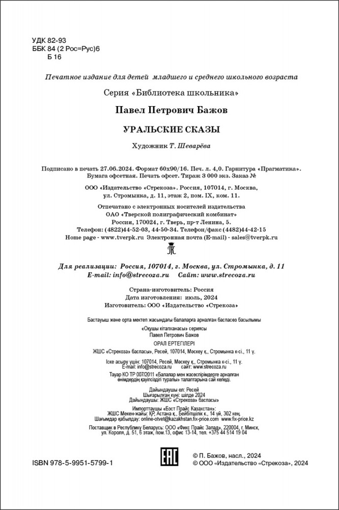 💳 Оплатить за товар можно при получении 🇰🇿 Есть бесплатная доставка по Казахстану от 1 дня 🎁 Копите бонусы с каждой покупки Серия: Библиотека школьника Произведения Павла Петровича Бажова давно вошли в золотой фонд детской литературы. Они повествуют о жизни простых уральских мастеров, одержимых своим делом, с их поверьями, приметами, страхами и радостями. В сборник вошли уральские сказы «Живинка в деле», «Голубая змейка», "Про Великого Полоза". |