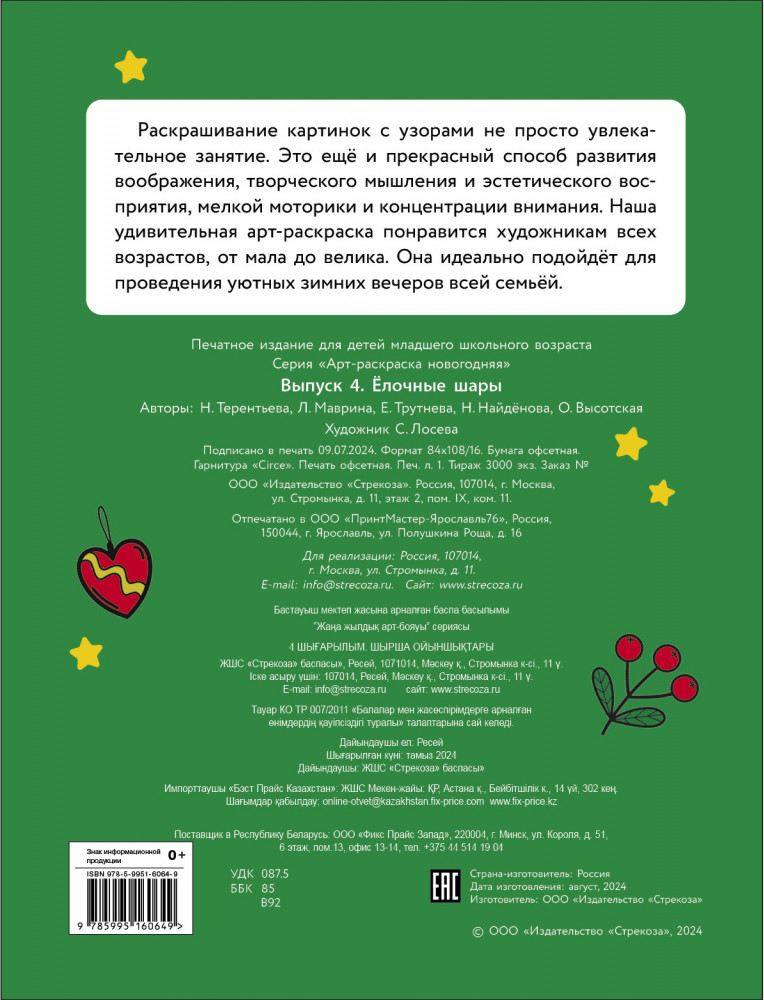 💳 Оплатить за товар можно при получении 🇰🇿 Есть бесплатная доставка по Казахстану от 1 дня 🎁 Копите бонусы с каждой покупки Раскрашивание картинок с узорами не просто увлекательное занятие. Это ещё и прекрасный способ развития воображения, творческого мышления и эстетического восприятия, мелкой моторики и концентрации внимания. Наша удивительная арт-раскраска понравится художникам всех возрастов, от мала до велика. Она идеально подойдёт для проведения уютных зимних вечеров всей семьёй. |