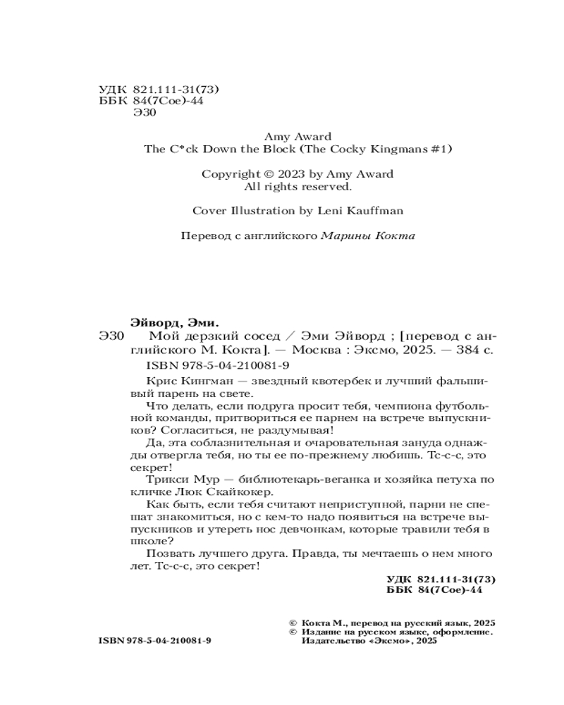 Мой дерзкий соседздоровые отношения спокойный сюжет остроумный юмор красивая обложка В данный момент этот товар отсутствует в продаже. Возможно, у нас найдется аналогичный или похожий товар здесь. Серия: Cupcake. Бестселлеры Буктока. Эми Эйворд Крис Кингман — звездный квотербек и лучший фальшивый парень на свете. Что делать, если подруга просит тебя, чемпиона футбольной команды, притвориться ее парнем на встрече выпускников? Согласиться, не раздумывая! Да, эта соблазнительная и очаровательная зануда однажды отвергла тебя, но ты ее по-прежнему любишь. Тс-с-с, это секрет! Трикси Мур — библиотекарь-веганка и хозяйка петуха по кличке Люк Скайкокер. Как быть, если тебя считают неприступной, парни не спешат знакомиться, но с кем-то надо появиться на встрече выпускников и утереть нос девчонкам, которые травили тебя в школе? Позвать лучшего друга. Правда, ты мечтаешь о нем много лет. Тс-с-с, это секрет! |