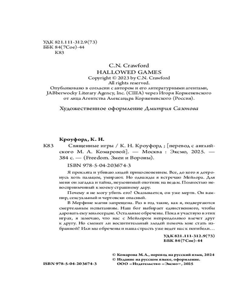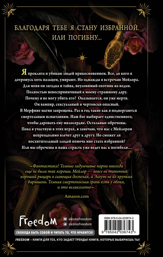 💳 Оплатить за товар можно при получении 🇰🇿 Есть бесплатная доставка по Казахстану от 1 дня 🎁 Копите бонусы с каждой покупки Серия: Freedom. Змеи и Вороны Власть в королевстве Мерфин держат фанатичные лидеры. Под запретом искусство, магия. Эти изверги охотятся на ведьм, которых называют Змеями. Элоуин как раз из таких: она способна убить прикосновением, и ее дар — проклятье. Девушка работает на барона Трокмора и заботится о мальчике Лео, родителей которого тоже убили из-за обвинений в колдовстве. Однажды, пытаясь защитить Лео, Элоуин применяет свои способности на Мэйлоре, охотнике на ведьм, но оказывается, что у того к ее магии иммунитет... |