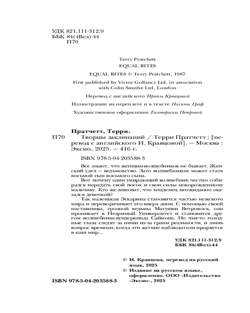 💳 Оплатить за товар можно при получении 🇰🇿 Есть бесплатная доставка по Казахстану от 1 дня 🎁 Копите бонусы с каждой покупки Серия: Магия Терри Пратчетта в иллюстрациях Полины Граф Все знают, что женщин-волшебников не бывает. Женский удел — ведьмовство. Зато волшебником может стать восьмой сын восьмого сына. Вот почему один умирающий волшебник честно собирался передать свой посох и свои силы новорожденному мальчику. Кто же виноват, что младенец неожиданно оказался девочкой? Так маленькая Эскарина становится частью мужского мира и переворачивает его вверх дном. С помощью своей наставницы, грозной ведьмы Матушки Ветровоск, она проникает в Незримый Университет и становится другом волшебника-вундеркинда Саймона. Но чьи-то голодные глаза следят за ними из-за грани реальности, и лишь вопрос времени, когда эти жуткие наблюдатели прорвутся в наш мир... |