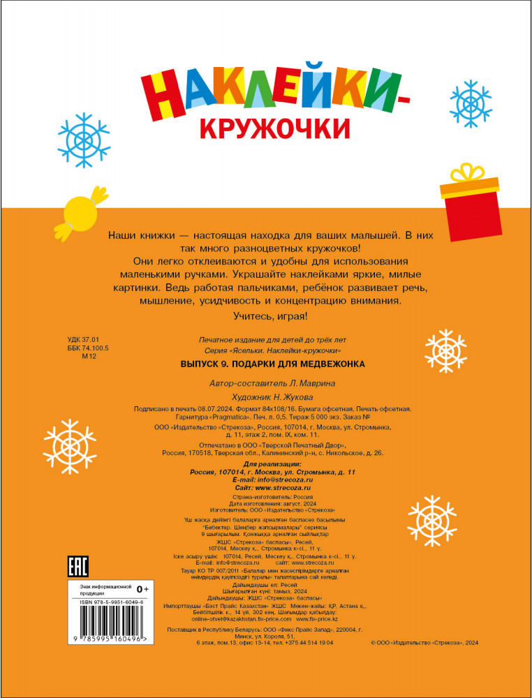 💳 Оплатить за товар можно при получении 🇰🇿 Есть бесплатная доставка по Казахстану от 1 дня 🎁 Копите бонусы с каждой покупки Серия: Ясельки. Наклейки-кружочки «Ясельки» — серия развивающих книжек для самых маленьких читателей. Приклеивать на картинки кружочки очень увлекательное и полезное занятие. Выбирая нужный цвет наклеек, вы можете повторить с малышом названия цветов, приклеивая кружочки — потренируете мелкую моторику рук, аккуратность и внимательность. Простые занятные сюжеты непременно заинтересуют малыша, а можно придумать с героями книжки свои истории. |