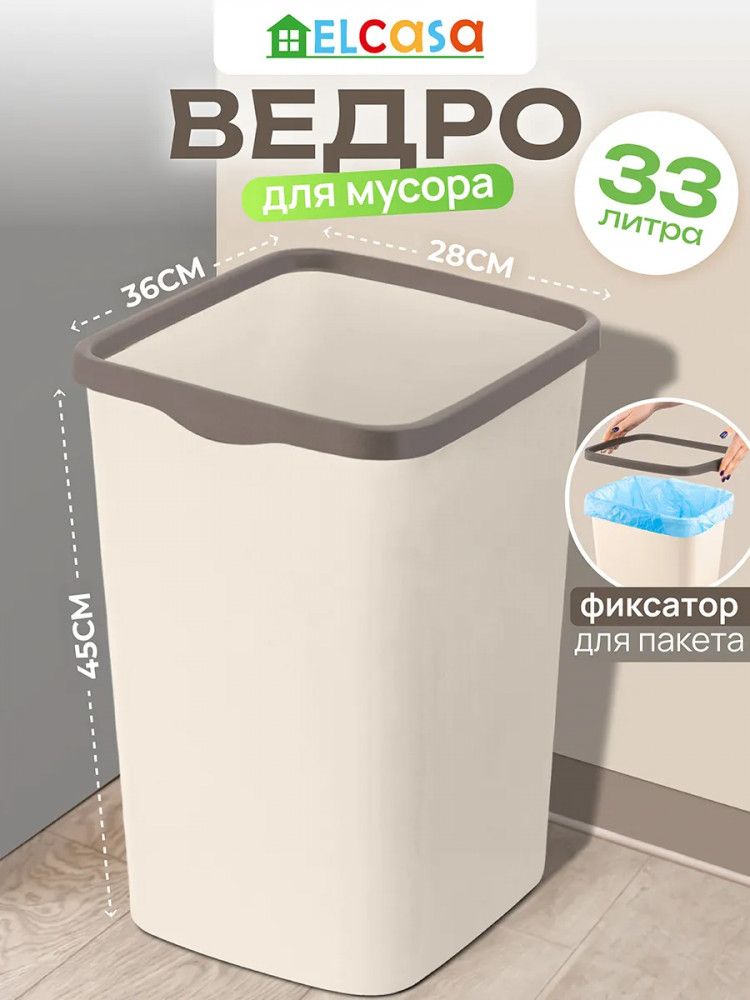 Ведро для мусора с фиксатором поможет поддерживать чистоту в вашем доме, офисе или на улице. Мусорное ведро выполнено из полипропилена. Этот вид пластика считается наиболее безопасным, так как не содержит бисфенол А и не выделяет вредных веществ. Мусорное ведро прямоугольной формы в шоколадном оттенке с фиксатором цвета слоновой кости можно разместить в ванной комнате, туалете или на кухне. Удобный держатель в виде ободка помогает зафиксировать мусорный пакет на ведре и не даёт ему сползать. Поставьте урну из пластика на пол возле раковины, стола или в хозяйственный шкаф.