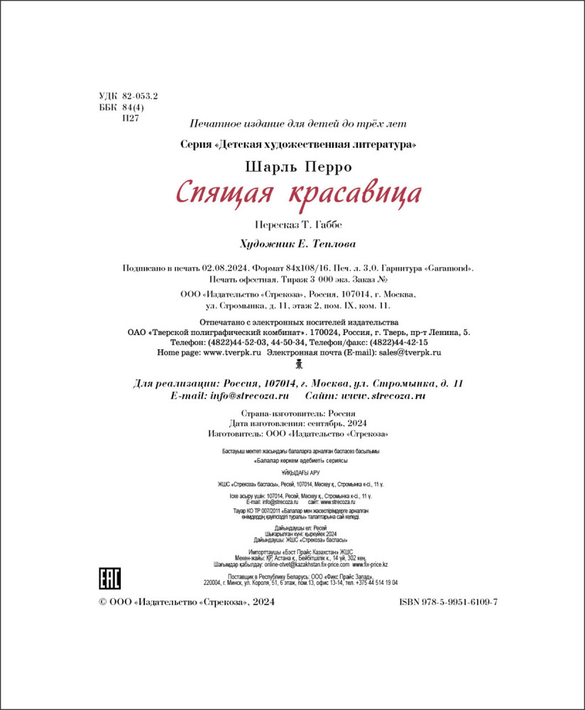 💳 Оплатить за товар можно при получении 🇰🇿 Есть бесплатная доставка по Казахстану от 1 дня 🎁 Копите бонусы с каждой покупки Серия: ДХЛ В книге вас ждет волшебная сказка, вышедшая из-под пера французского писателя Шарля Перро в 1697 году. Русские малыши познакомились с ней благодаря бережному и высокохудожественному пересказу Тамары Габбе. |