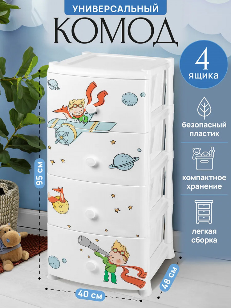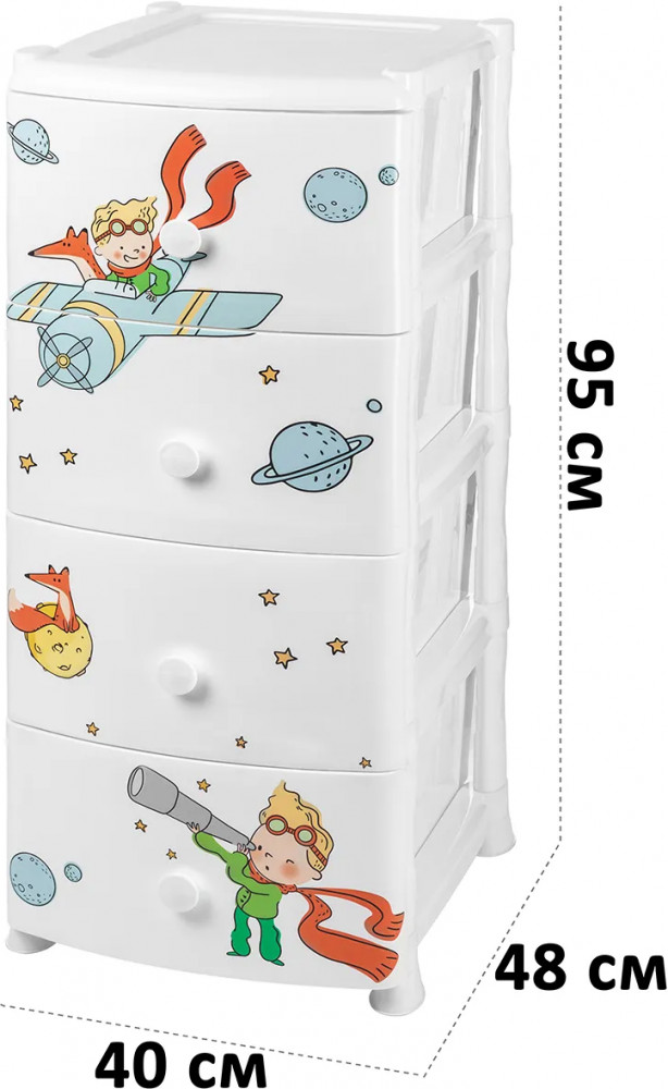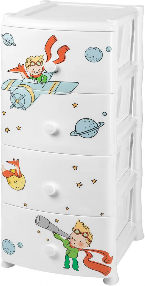 В данный момент этот товар отсутствует в продаже. Возможно, у нас найдется аналогичный или похожий товар здесь. Комод четырёхсекционный белого цвета украшен сплошным красочным рисунком на фасаде. Пластиковый шкаф с 4 ящиками — это практичное решение для хранения любых вещей и мелочей в вашем доме. Внутренний размер ящика по верху 44×32×19.5 см, по дну 43×30 см, высота ножек 5 см. Максимальная нагрузка на ящик 20 кг, максимальная нагрузка на комод 100 кг. Мальчика окружает множество далеких звёзд, а смешная рыжая лисичка ждёт его в гости на своей планете. Мебель изготовлена из пищевого пластика — полипропилена. Материал не выделяет вредных веществ, безопасен для здоровья взрослых и детей. За счёт экологичности подходит для хранения посуды, овощей и фруктов, а также продуктов.