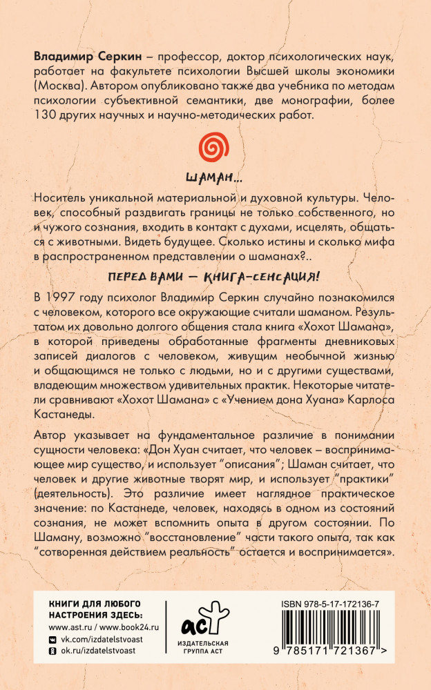 💳 Оплатить за товар можно при получении 🇰🇿 Есть бесплатная доставка по Казахстану от 1 дня 🎁 Копите бонусы с каждой покупки Серия: Философия шамана В 1997 году психолог Владимир Серкин случайно познакомился с человеком, которого все окружающие считали шаманом. Результатом их довольно долгого общения стала книга «Хохот Шамана», в которой приведены обработанные фрагменты дневниковых записей диалогов с человеком, живущим необычной жизнью и общающимся не только с людьми, но и с другими существами, владеющим множеством удивительных практик. Некоторые читатели сравнивают «Хохот Шамана» с «Учением дона Хуана» Карлоса Кастанеды. |