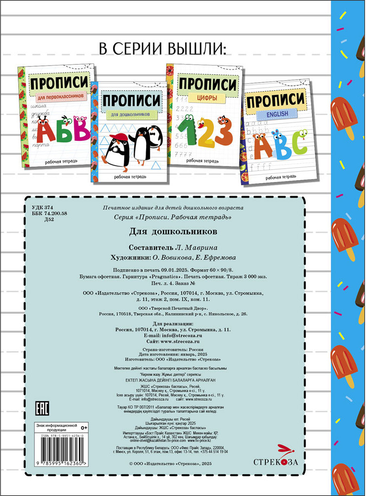 💳 Оплатить за товар можно при получении 🇰🇿 Есть бесплатная доставка по Казахстану от 1 дня 🎁 Копите бонусы с каждой покупки Прописи адресованы дошкольникам и предназначены для отработки и закрепления графических навыков. Ребенку предлагается выполнить задания на штриховку и дорисовку, рисование по клеточкам, дорисовку картинок и раскрашивание. Пособие поможет не только развить графические умения и подготовить к письму руку ребёнка, но и приучат его к усидчивости, аккуратности и терпению, а красочные яркие рисунки разбудят фантазию и творчество. |