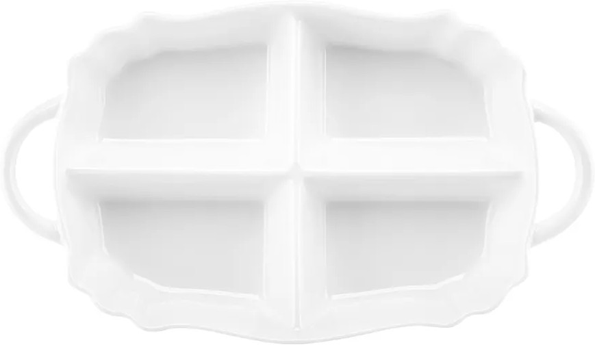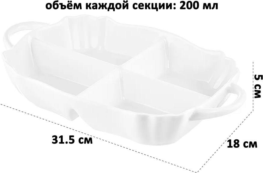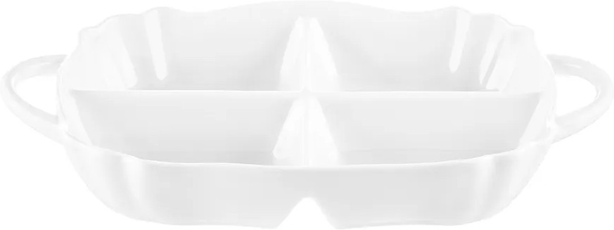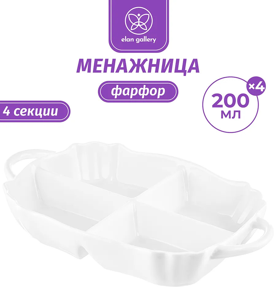 Глубокая менажница с ручками от бренда Elan Gallery «Айсберг» размером 31.5×18×5 см имеет 4 секции и выполнена из белого фарфора. Можно использовать в роли конфетницы для подачи разных конфет, мармелада и печенья. Представляет собой цельное блюдо с 4 глубокими отсеками объёмом по 200 мл каждый. Тарелка с разделителями создана для оригинальной сервировки и подачи различных закусок: сырной и мясной нарезки, оливок и маслин. Сервировочное блюдо пригодится, чтобы создать идеальную атмосферу для приема гостей или романтического ужина дома. Благодаря отдельным секциям вы можете использовать одну и ту же порционную тарелочку для солений, сыра и колбасы. Такой подход к сервировке позволит сэкономить место на вашем столе. Положите орехи, ягоды и кусочки овощей и фруктов в одно и то же блюдо, разложив их по отделениям. Возьмите на пикник, эргономичная форма позволит разместить все необходимые закуски и сладости. Форму можно использовать в роли салатника для маленьких порций салата.