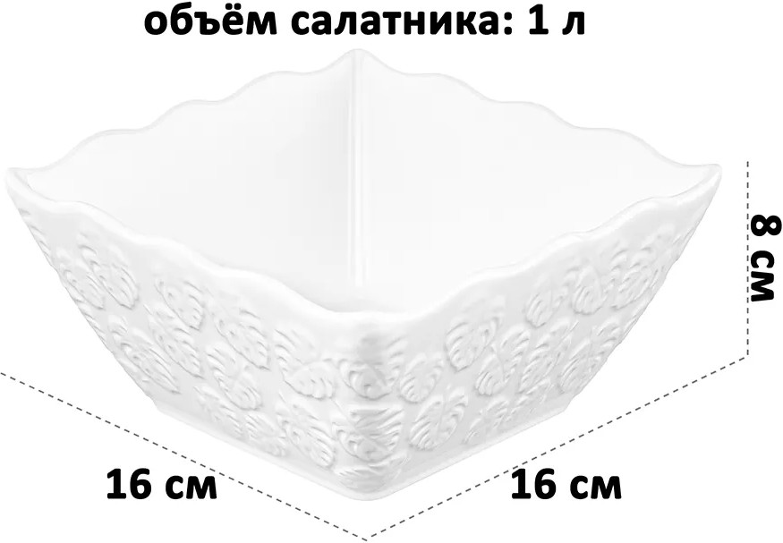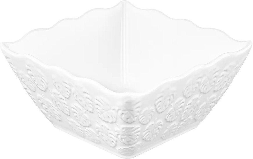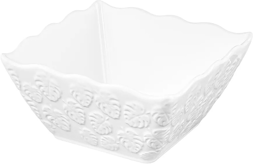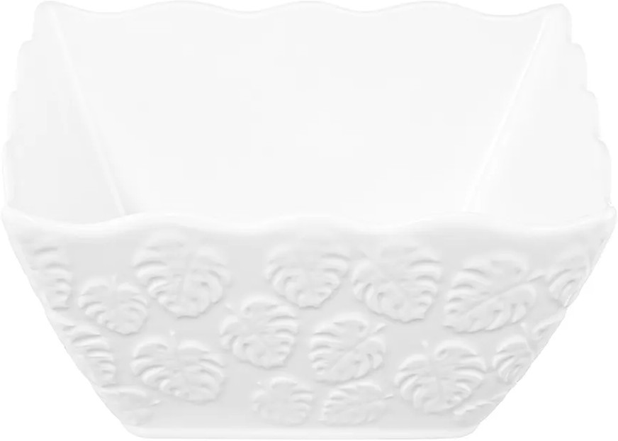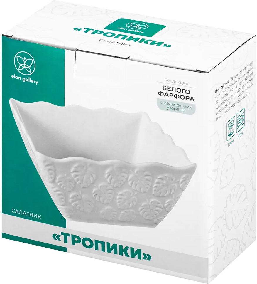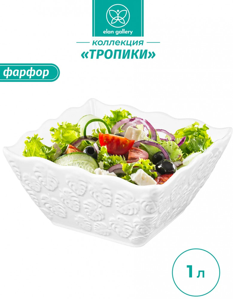 Салатник Elan Gallery «Тропики» квадратной формы выполнен из белого фарфора. Глубокое сервировочное блюдо украшено рельефными узорами и имеет волнистые края. Размер глубокой тарелки — 16×16×8 см, объём — 1 литр. Салатница с фигурными краями займёт отличное место в вашей коллекции фарфоровой посуды. Фарфоровая мисочка удобна для смешивания ингредиентов. Используйте тарелку для любых закусок и угощения гостей на празднике или вечеринке. Подойдет не только для салатов, можно использовать для сервировки любых сладостей, например, конфет или печенья. Положите в фарфоровую ёмкость свежие фрукты или овощи, чтобы порадовать гостей. Благодаря глубокой форме салатницу можно использовать для сервировки каши, плова и гарниров. Красивый кухонный инвентарь станет незаменимым помощником при сервировке стола и предметом декора вашего дома.