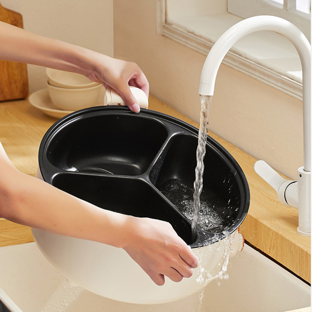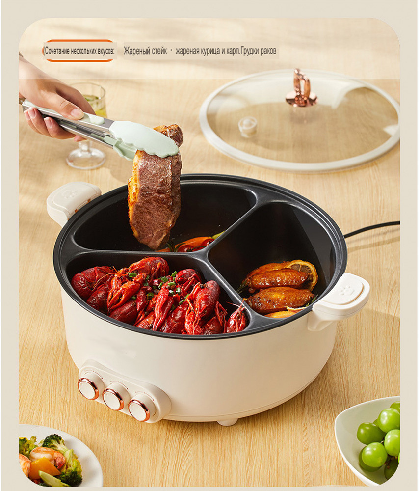 Разные способы готовки: можно варить суп, готовить на гриле, готовить во фритюре или делать фондю — или все это одновременно! Нагрев 2000 Вт позволяет быстро приготовить еду, а также долго поддерживать ее горячей. Хого состоит из внутренней антипригарной части, средней части из нержавеющей стали и внешней кастрюли (части не разбираются) Легко мыть водой или протирать влажной тряпкой благодаря антипригарному покрытию. |