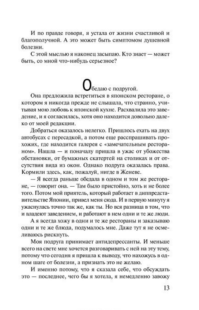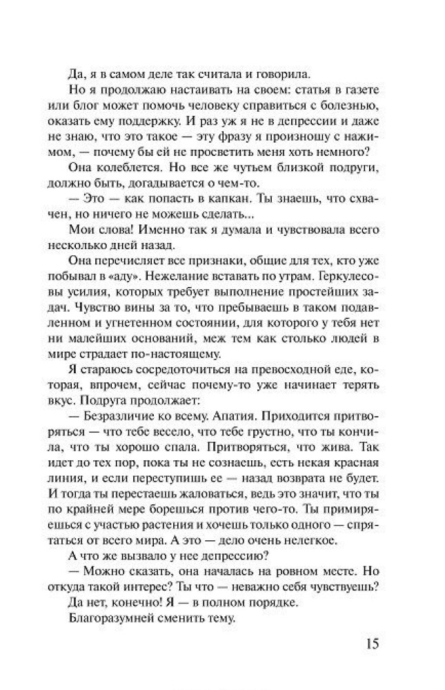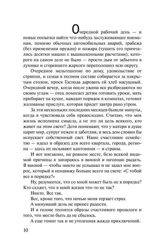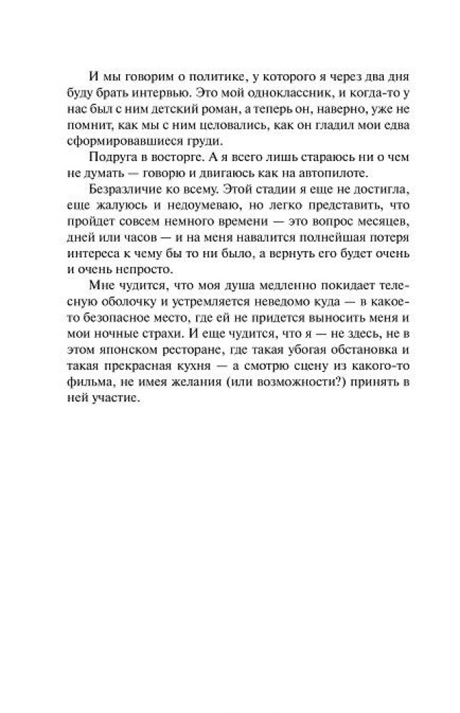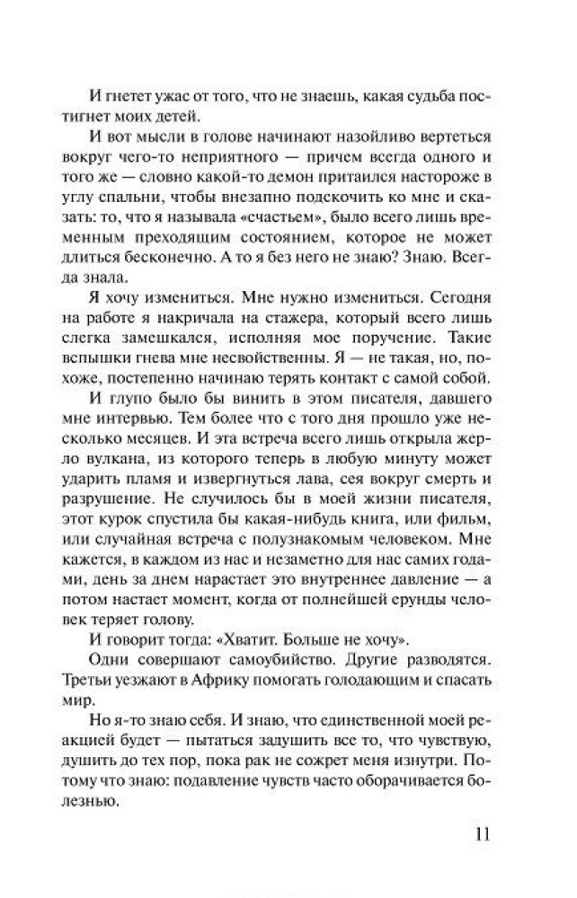 Прочитала за один вечер. По самой книге. Читается очень легко, шрифт огромный, листы белые, обложка приятная на ощупь. По содержанию. Не скажу, что прям сильно сопереживала героине, наверное, просто я лишена страсти или у меня имеются более насущные проблемы, но, которые тоже вгоняют в осеннюю хандру, переходящую в зимнюю депрессию. Но, приятно осознавать, что мы не одиноки, в своем одиночестве... Ставлю отлично, за то что автор - Пауло Коэльо, который подарил нам свои творения, как Пятая Гора, Алхимик, от которых душа светится... Спасибо, за то, что старался понять женскую логику, у него это получается не плохо... Рекомендовать не буду, но и отрекомендовывать не стану. Читайте то, что требует мозг и душа...