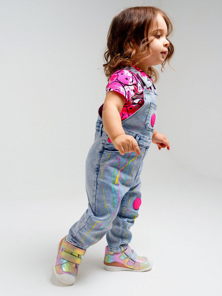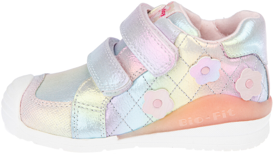 Кроссовки из искусственной перламутровой кожи. В модели использованы BIO-FIT технологии для правильного формирования стопы ребенка: стабилизация, дышащий антибактериальный материал для стельки, ходовая часть подошвы с амортизирующими элементами. Подкладка выполнены из 100% хлопка. Модель имеет две застежки липучки для удобства обувания. Съемная кожаная профилированная стелька с анатомической формой способствует равномерному распределению давления и препятствует развитию плоскостопия. Материал подошвы парфюмирован запахом жевательной резинки.