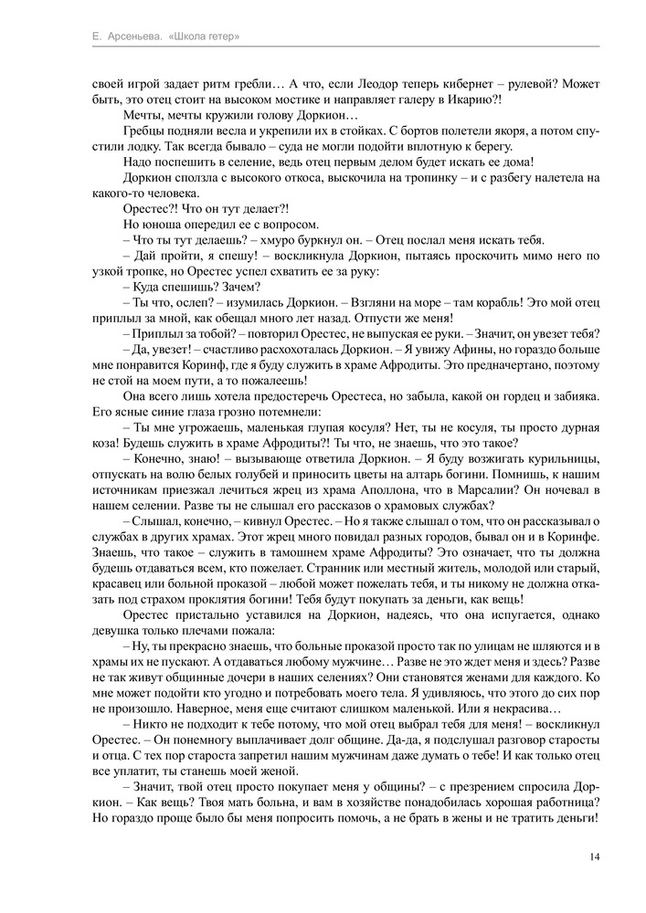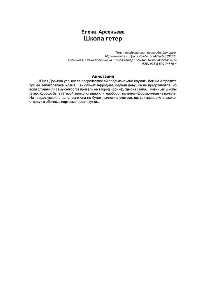 Школа гетерВ данный момент этот товар отсутствует в продаже. Возможно, у нас найдется аналогичный или похожий товар здесь. Серия: Школа гетер. Романы Е. Арсеньевой Юная Доркион услышала пророчество: ей предназначено служить богине Афродите при ее великолепном храме. Как служат Афродите, бедная девушка не представляла, но воля случая или замысел богов привели ее в город Коринф, где она стала ученицей школы гетер. Хорошо быть гетерой, плохо, стыдно или, наоборот, почетно, – Доркион еще не поняла. Но твердо усвоила одно: если она не будет прилежно учиться, ее, как заведено в школе, отдадут в обычные портовые проститутки. |