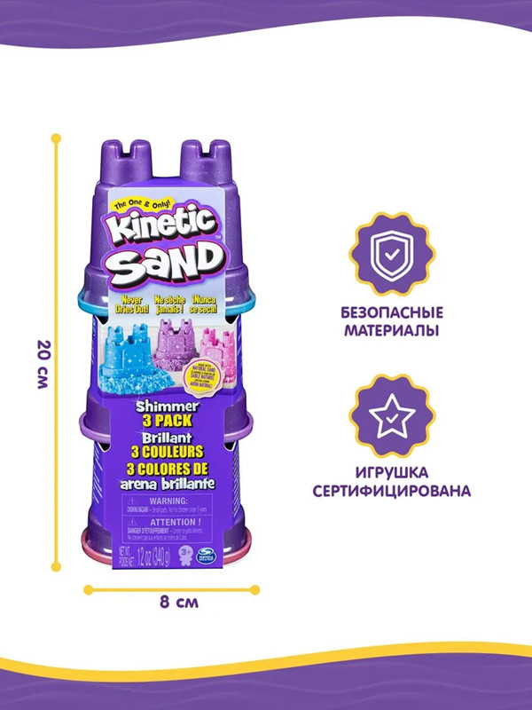Из размятого кинетического песка создается красивая башенка благодаря формочке или любые другие фигурки. С Kinetic sand ребенок познакомится с цветами, сможет развить моторику, творческое видение и сенсорное восприятие. С этим песком можно не только играть, а еще рисовать и делать творческие поделки! Кинетический песок не токсичный и гипоаллергенный, сделан из натурального песка! Песок прилипает к самому себе, его так просто убрать! Он не высыхает, его можно размять и играть снова и снова!