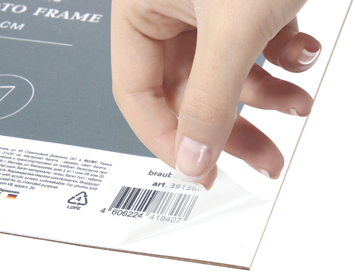Ширина багета — 12 мм, высота — 10 мм. Вставка из акрила вместо обычного стекла делает рамки менее хрупкими. Перед применением снимите пленку с обеих сторон экрана. Задняя панель рамок выполнена из плотного картона, который обеспечивает плотное прилегание и отсутствие в будущем деформации содержимого в рамках. Комплект из рамок поставляется в трехслойном гофрокоробе, при этом каждая рамка из комплекта индивидуально упакована в термоусадочную пленку.