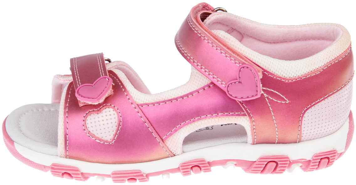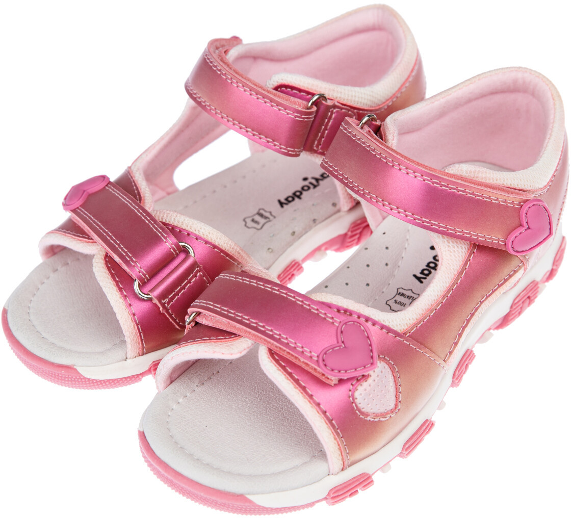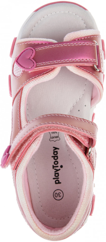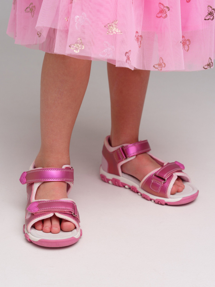 Сандалии из искусственной кожи и текстиля. Модель имеет два ремешка с липучками, которые обеспечивают удобство обувания и регулируют объем. Подкладка выполнена из текстиля с высоким содержанием хлопка. Стелька из натуральной кожи с анатомическим элементом поддерживает свод стопы в правильном положении. Эргономичная форма колодки обеспечивает правильное формирование стопы ребенка. Формоустойчивый задник поддерживает стопу в правильном положении. Легкая подошва из терморезины обладает повышенной гибкостью и прочностью. Материал подошвы парфюмирован запахом жевательной резинки.