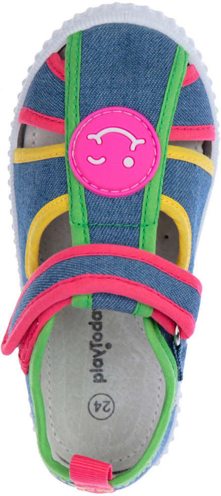 Сандалии из дышащего текстиля. Подкладка выполнена из 100% хлопка. Стелька выполнена из натуральной кожи и имеет анатомический элемент для поддержания свода стопы. Подошва из ПВХ легкая и гибкая.