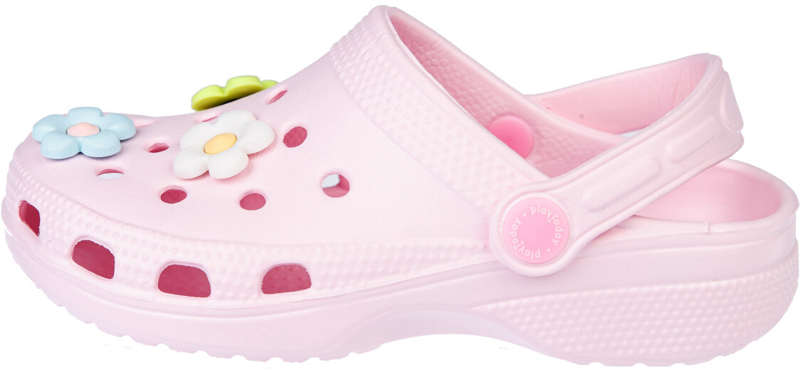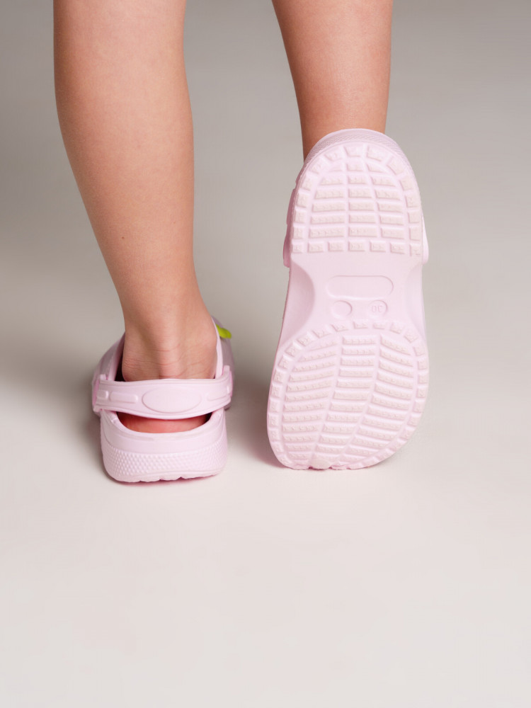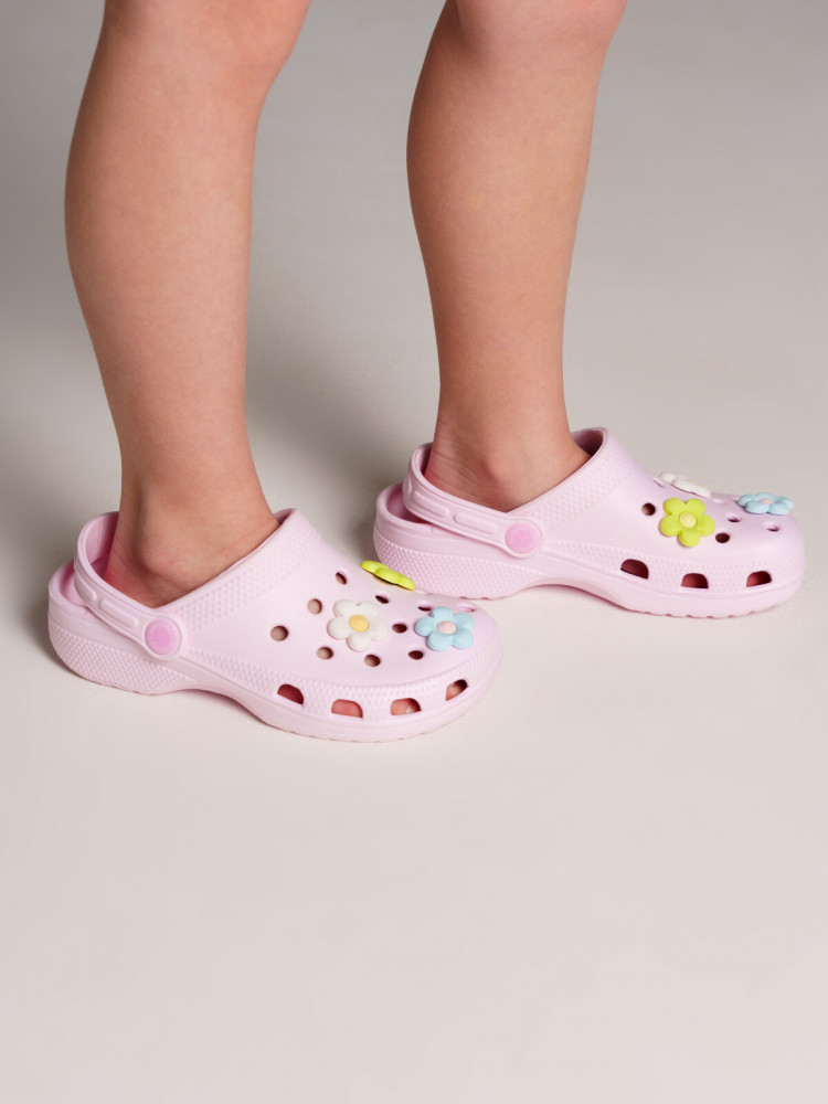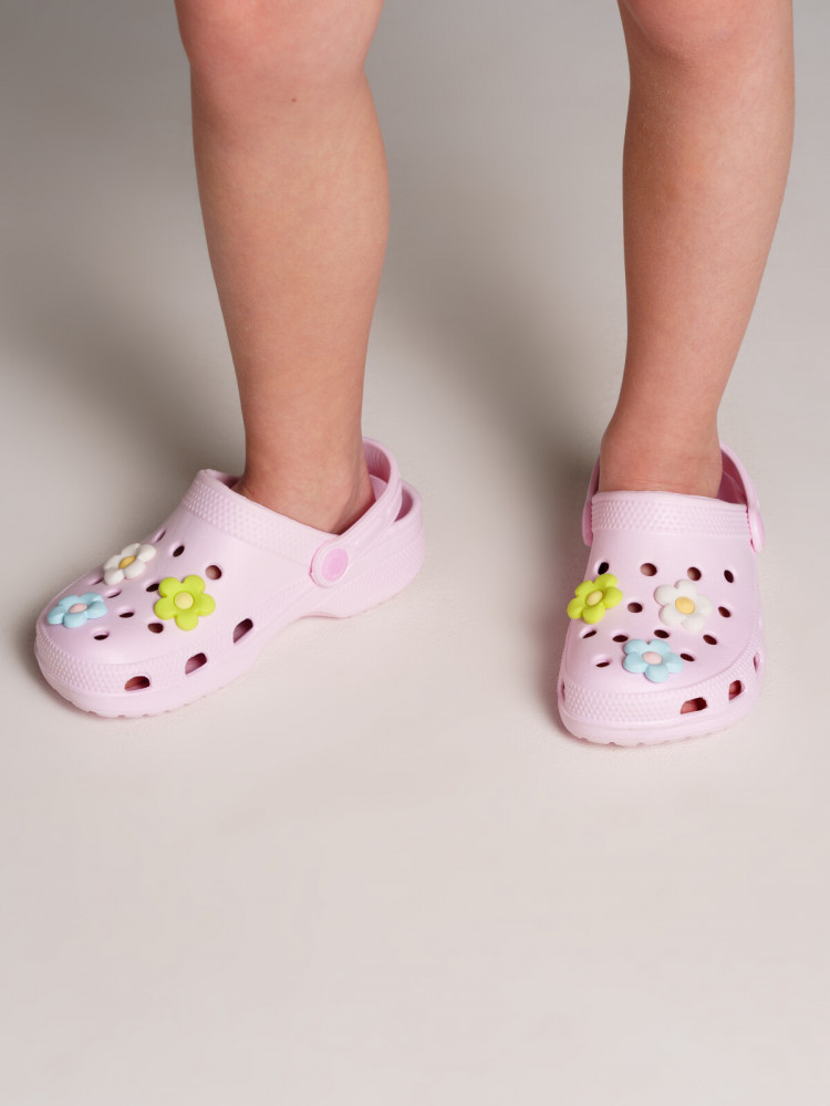 Сабо из облегченного и прочного ЭВА. Материал хорошо моется. Модель имеет разноцветные джибитцы цветочки. Форма модели учитывает эргономику стопы. Модель имеет перекидной ремешок для лучшей фиксации обуви на ноге.