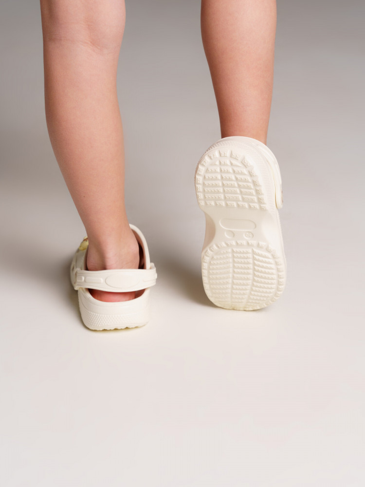 Сабо из облегченного и прочного ЭВА. Материал хорошо моется. Модель украшена милыми джибитцами. Форма модели учитывает эргономику стопы. Модель имеет перекидной ремешок для лучшей фиксации обуви на ноге.