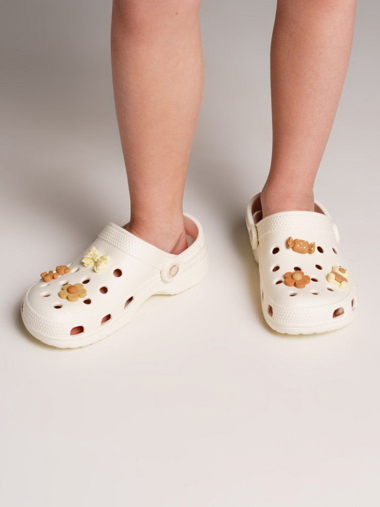 Сабо из облегченного и прочного ЭВА. Материал хорошо моется. Модель украшена милыми джибитцами. Форма модели учитывает эргономику стопы. Модель имеет перекидной ремешок для лучшей фиксации обуви на ноге.