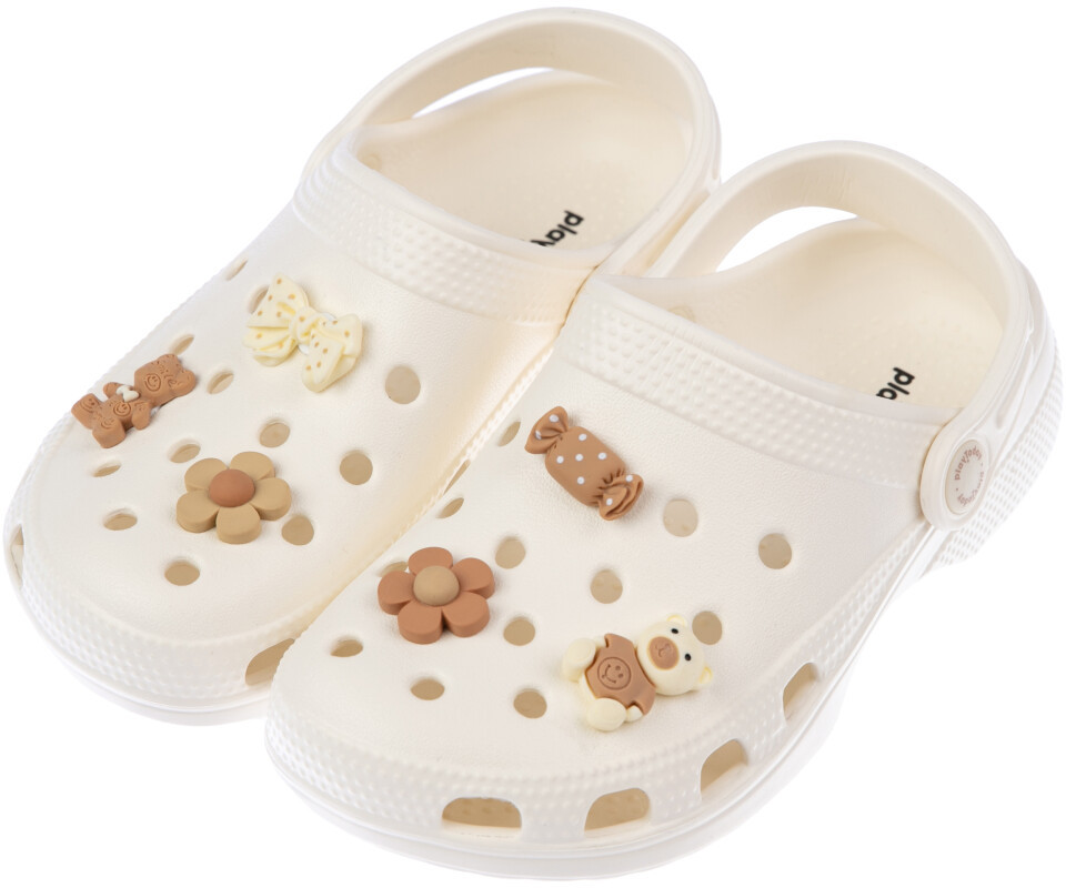 Сабо из облегченного и прочного ЭВА. Материал хорошо моется. Модель украшена милыми джибитцами. Форма модели учитывает эргономику стопы. Модель имеет перекидной ремешок для лучшей фиксации обуви на ноге.
