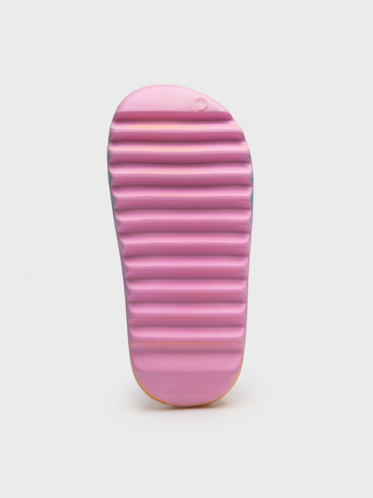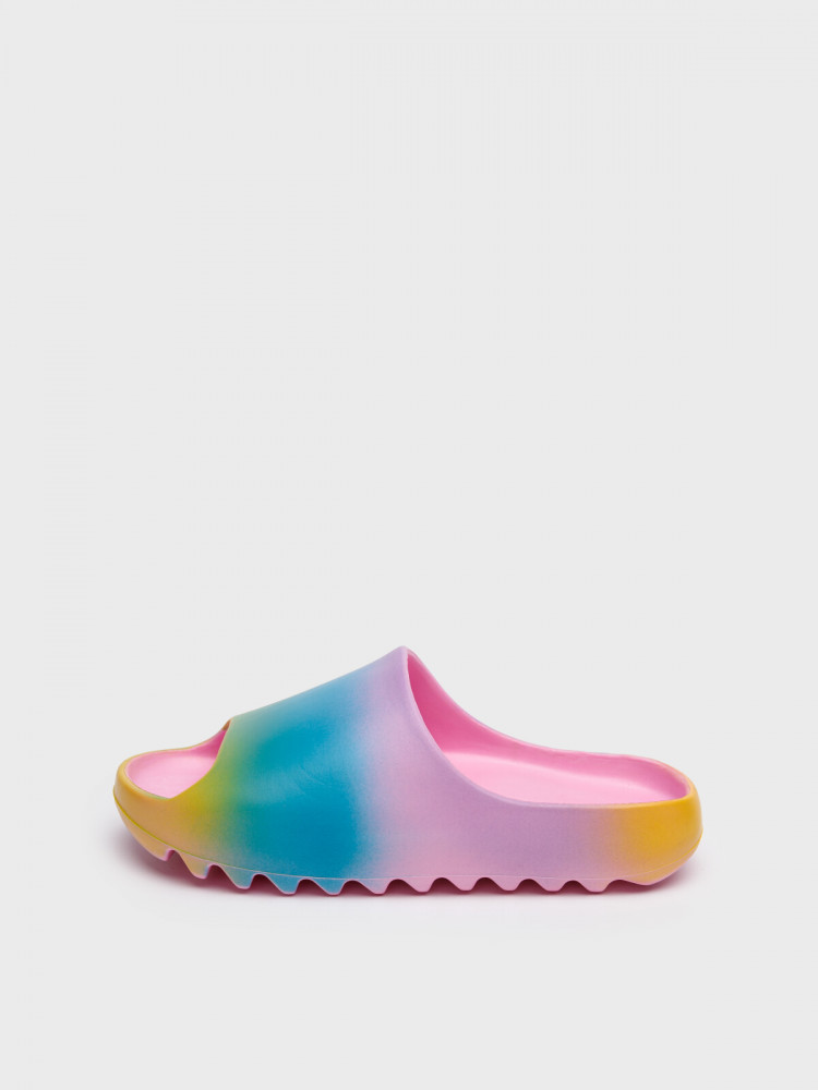 Модные шлепанцы для девочки подростка. Модель имеет радужный градиент окрашивания. Сабо для пляжа и бассейна из облегченного и прочного ЭВА. Материал хорошо моется. Форма модели учитывает эргономику стопы.