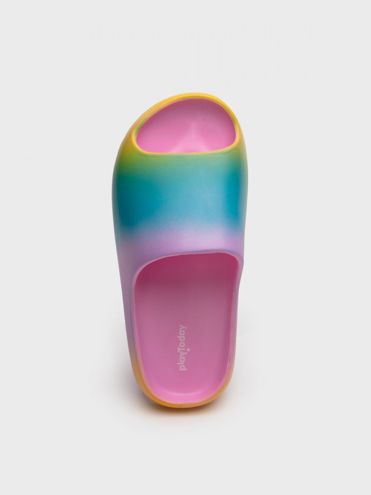 Модные шлепанцы для девочки подростка. Модель имеет радужный градиент окрашивания. Сабо для пляжа и бассейна из облегченного и прочного ЭВА. Материал хорошо моется. Форма модели учитывает эргономику стопы.