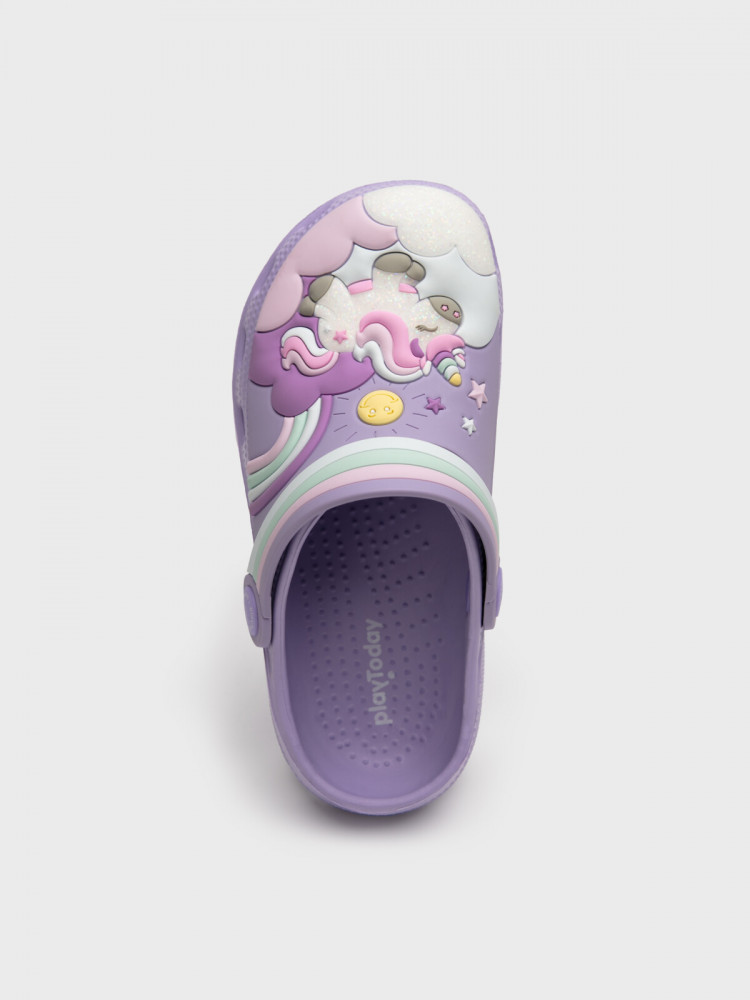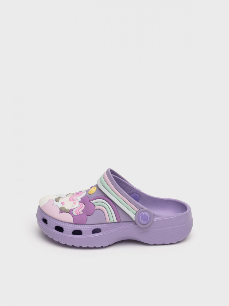 Сабо детские для девочки. Сабо из облегченного и прочного ЭВА. Материал хорошо моется. Модель имеет объемный рисунок с единорогами. Форма модели учитывает эргономику стопы. Модель имеет цветной перекидной ремешок для лучшей фиксации обуви на ноге. Благодаря вентиляционным отверстиям сабо проветриваются, ноги ребенка дышат и не потеют.