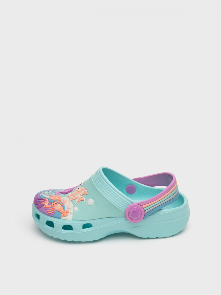 Сабо детские для девочки. Сабо из облегченного и прочного ЭВА. Материал хорошо моется. Объемный рисунок на правой и левой полупарах рассказывают нам целую историю подводного мира. Форма модели учитывает эргономику стопы. Модель имеет цветной перекидной ремешок для лучшей фиксации обуви на ноге. Благодаря вентиляционным отверстиям сабо проветриваются, ноги ребенка дышат и не потеют.