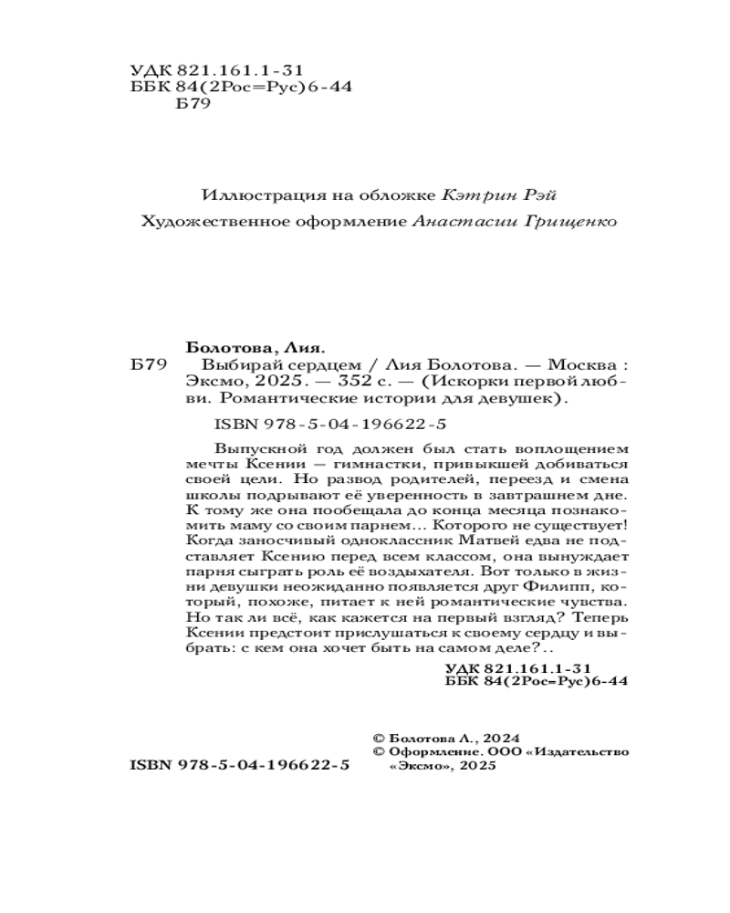 💳 Оплатить за товар можно при получении 🇰🇿 Есть бесплатная доставка по Казахстану от 1 дня 🎁 Копите бонусы с каждой покупки Серия: Искорки первой любви. Романтические истории для девушек Новинка в серии одиночных романтических историй российских авторов «Искорки первой любви». Это нежные и трогательные романы для подростков в духе книг Аси Лавринович и Алекс Хилл. «Выбирай сердцем» — роман о школьной влюбленности, об отношениях с родителями и о том, как важно прислушиваться к себе. Потрясающей красоты оформление — серебристая фольга и лак с блестками. Книга станет чудесным украшением полки. |