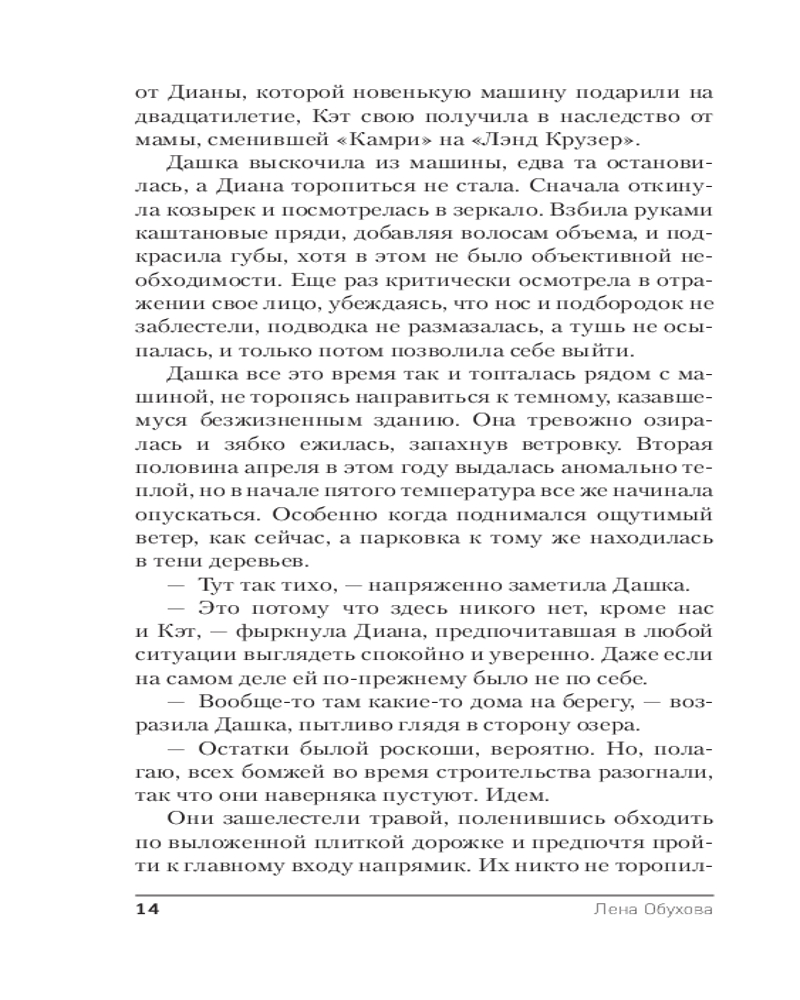 💳 Оплатить за товар можно при получении 🇰🇿 Есть бесплатная доставка по Казахстану от 1 дня 🎁 Копите бонусы с каждой покупки Серия: Городские легенды Лены Обуховой На берегу Медвежьего озера готовится к открытию новая гостиница. Тихий уголок, умиротворяющий пейзаж, новое современное здание — что может пойти не так? И все же хозяйка пока еще пустующей гостиницы слышит странные звуки, ночью видит женский силуэт, бродящий по этажам, а на берегу озера находит труп помощницы. Полиции не терпится все свалить на нее, поэтому придется самой взяться за расследование, чтобы доказать свою невиновность. Но удастся ли ей защититься от пока неведомой угрозы и противостоять сверхъестественному злу? Одно понятно: возвращение в Шелково для Юли Ткачевой не будет легким. |