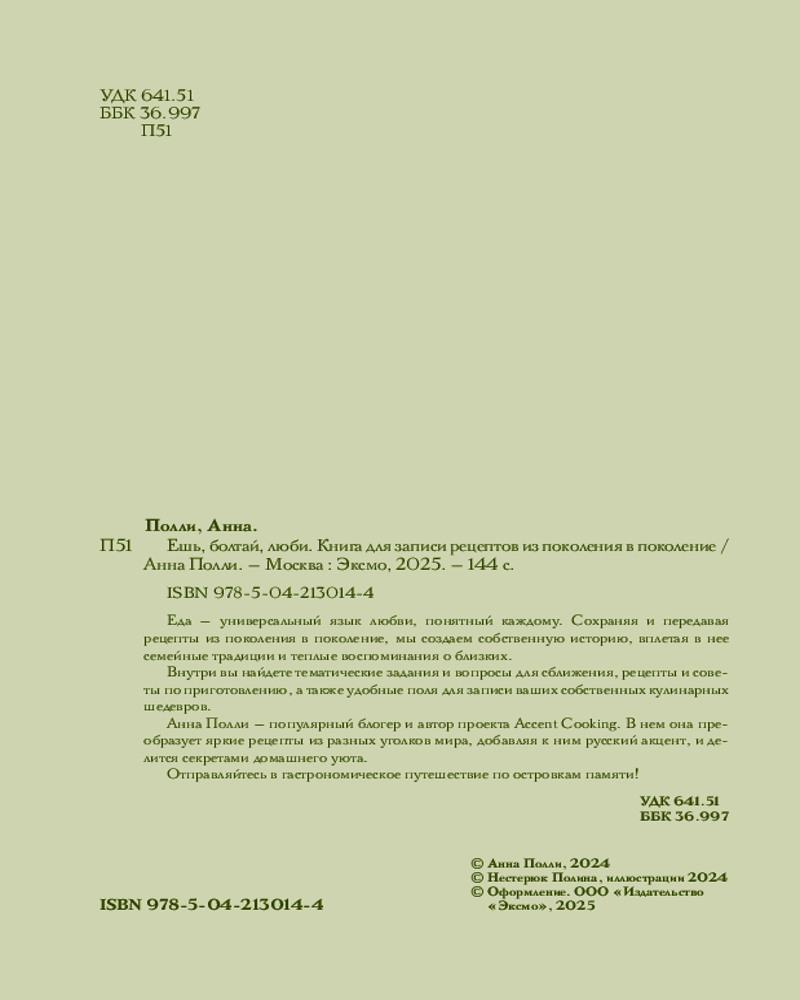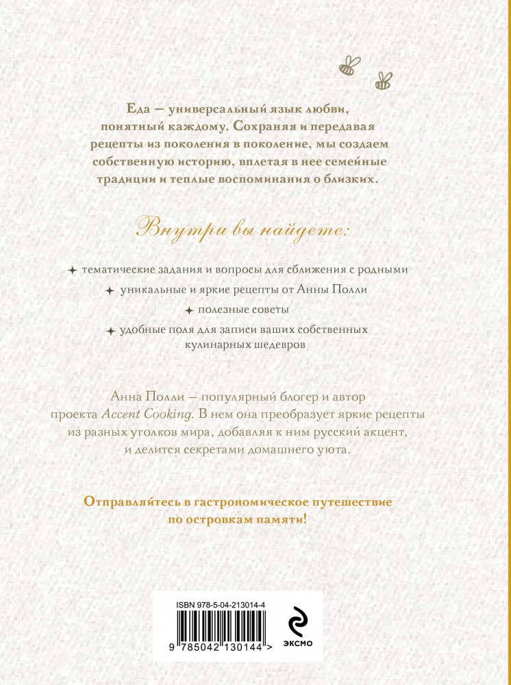 💳 Оплатить за товар можно при получении 🇰🇿 Есть бесплатная доставка по Казахстану от 1 дня 🎁 Копите бонусы с каждой покупки Серия: Slow life. Бабушка, расскажи. Книги для записи рецептов Еда — универсальный язык любви, понятный каждому. Сохраняя и передавая рецепты из поколения в поколение, мы создаем собственную историю, вплетая в нее семейные традиции и теплые воспоминания о близких. Внутри вы найдете тематические задания и вопросы для сближения, рецепты и советы по приготовлению, а также удобные поля для записи ваших собственных кулинарных шедевров. Анна Полли — популярный блогер и автор проекта Accent Cooking. В нем она преобразует яркие рецепты из разных уголков мира, добавляя к ним русский акцент, и делится секретами домашнего уюта. Отправляйтесь в гастрономическое путешествие по островкам памяти! |