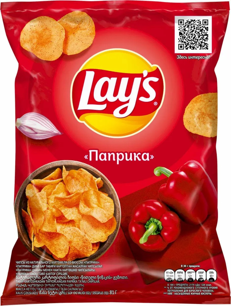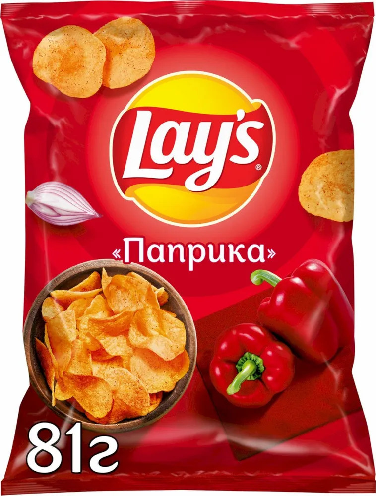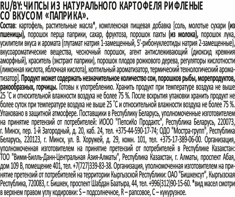 Картофель, растительное масло, ароматизаторы [соль, молотые сухари (содержат пшеницу), порошок перца паприки, сахар, фруктоза, порошок пахты, порошок лука, усилители вкуса и аромата (глутамат натрия 1-замещенный, 5’-рибонуклеотиды натрия 2-замещенные), вкусоароматические вещества, чесночный порошок, агент антислеживающий (диоксид кремния аморфный), краситель (экстракт паприки), порошок плодов рожкового дерева, регуляторы кислотности (лимонная кислота, яблочная кислота), коптильный ароматизатор, термический технологический ароматизатор].
