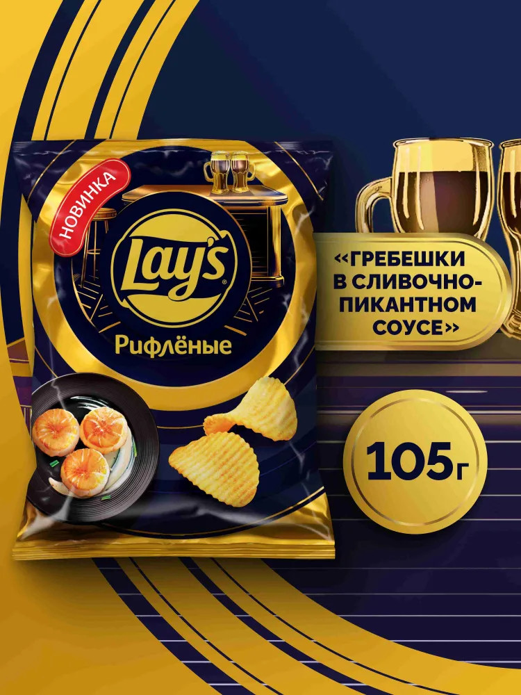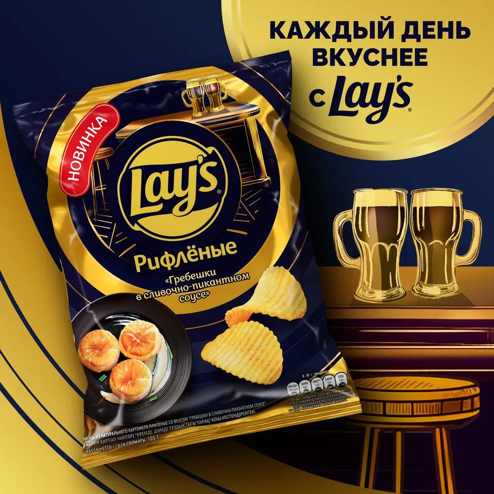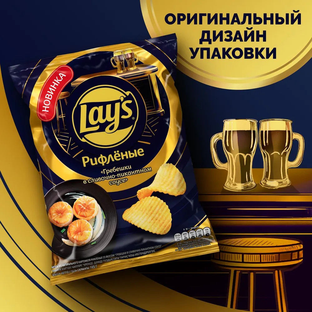 Картофель, растительные масла, комплексная пищевая добавка [сахар, соль, порошок молочной сыворотки, усилители вкуса и аромата (глутамат натрия 1-замещенный, 5'-гуанилат натрия 2-замещенный, 5'-Инозинат натрия 2-замещенный ), вкусоароматические вещества (содержат рыбное масло, сливочное масло), порошок чеснока, сырный порошок, перец белый молотый, регулятор кислотности (лимонная кислота), термический технологический ароматизатор]. Содержит глютен.