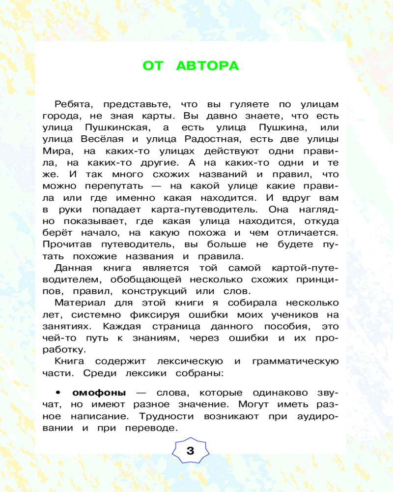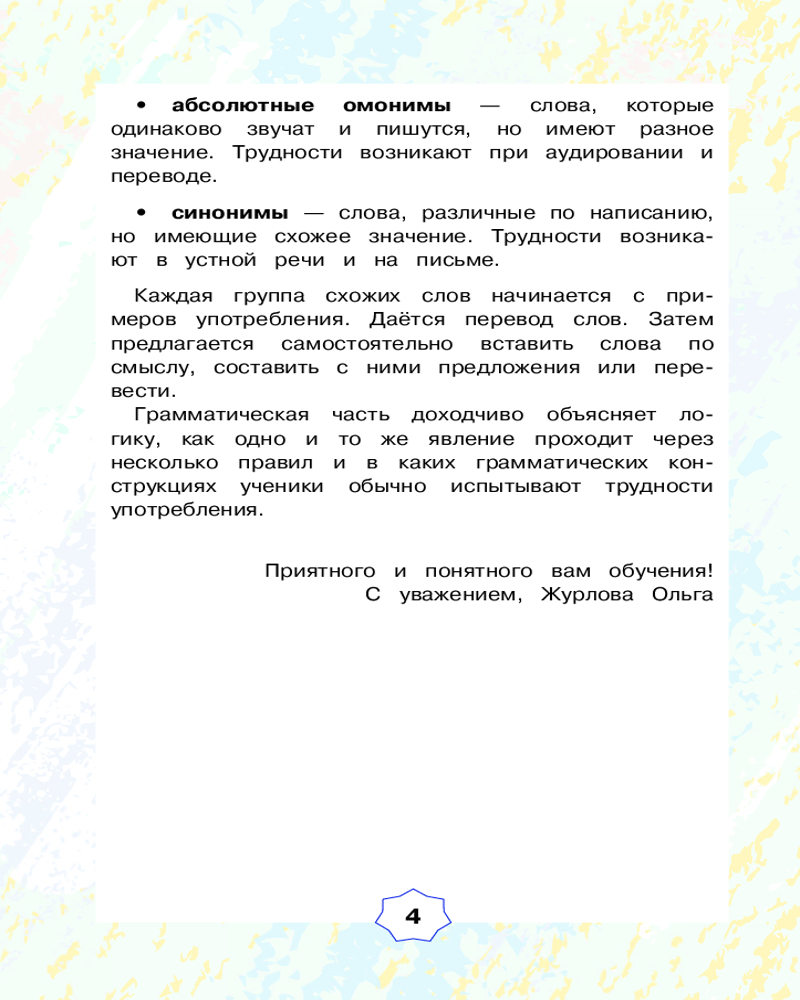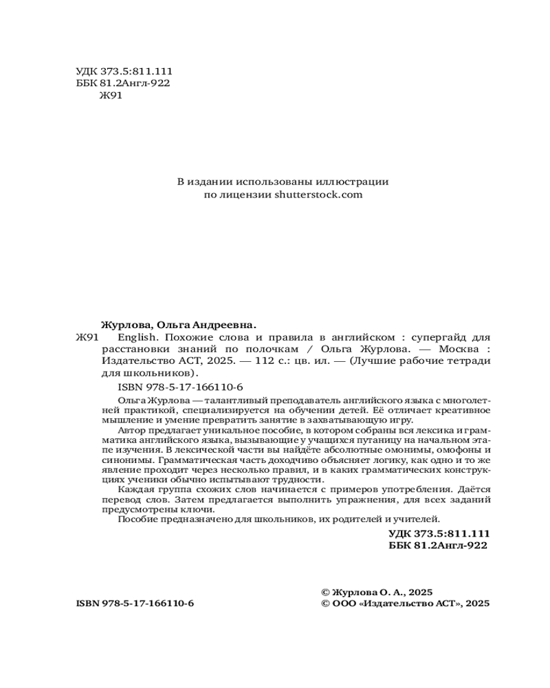 💳 Оплатить за товар можно при получении 🇰🇿 Есть бесплатная доставка по Казахстану от 1 дня 🎁 Копите бонусы с каждой покупки Серия: Лучшие рабочие тетради для школьников Ольга Журлова — талантливый преподаватель английского языка с многолетней практикой, специализируется на обучении детей. Её отличает креативное мышление и умение превратить занятие в захватывающую игру. Автор предлагает уникальное пособие, в котором собраны вся лексика и грамматика английского языка, вызывающие у учащихся путаницу на начальном этапе изучения. В лексической части вы найдёте абсолютные омонимы, омофоны и синонимы. Грамматическая часть доходчиво объясняет логику, как одно и то же явление проходит через несколько правил, и в каких грамматических конструкциях ученики обычно испытывают трудности. Каждая группа схожих слов начинается с примеров употребления. Даётся перевод слов. Затем предлагается выполнить упражнения, для всех заданий предусмотрены ключи. Пособие предназначено для школьников, их родителей и учителей. |